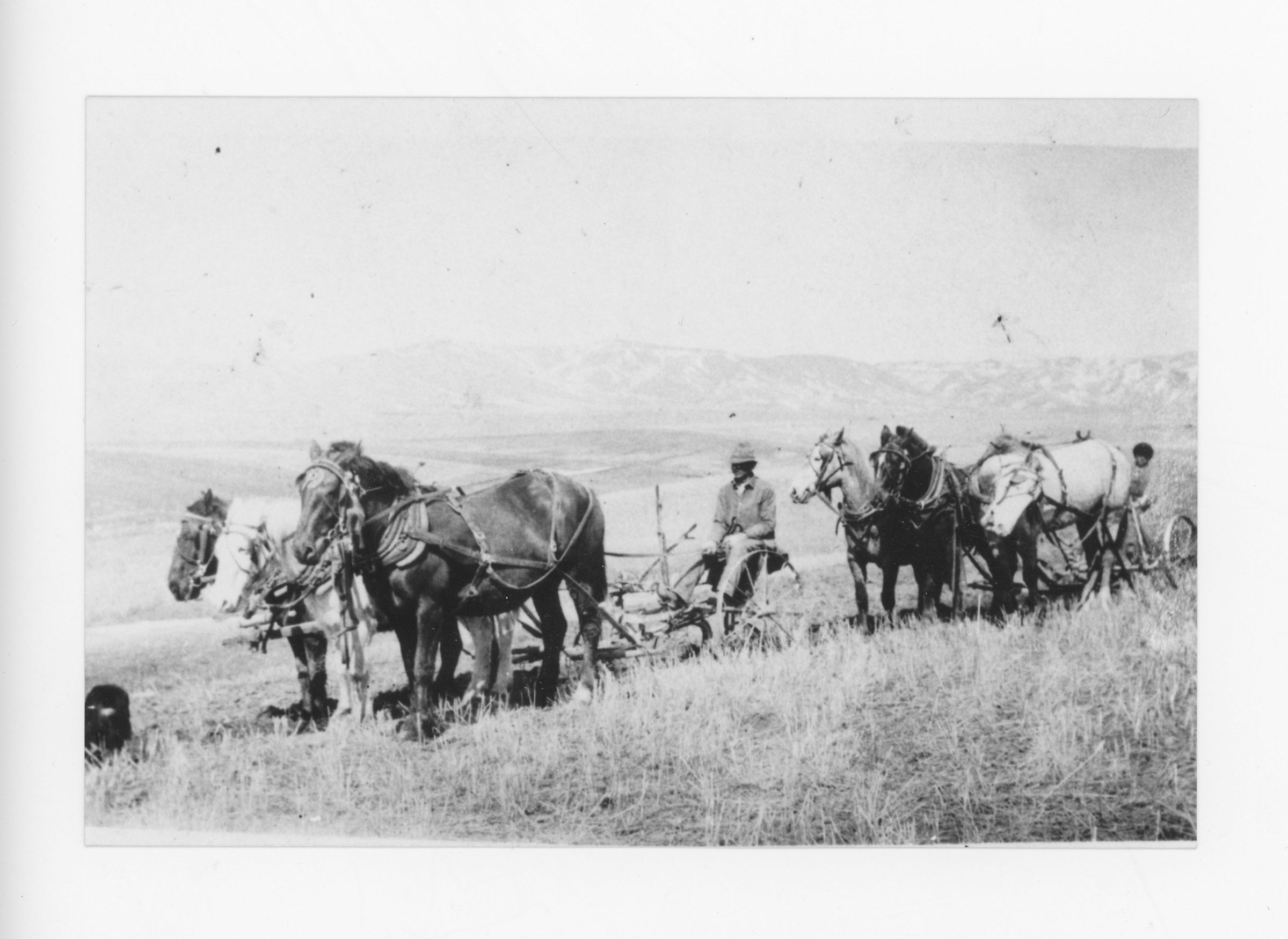 Men sitting on horse-led ploughs in a field on Antelope Island.
