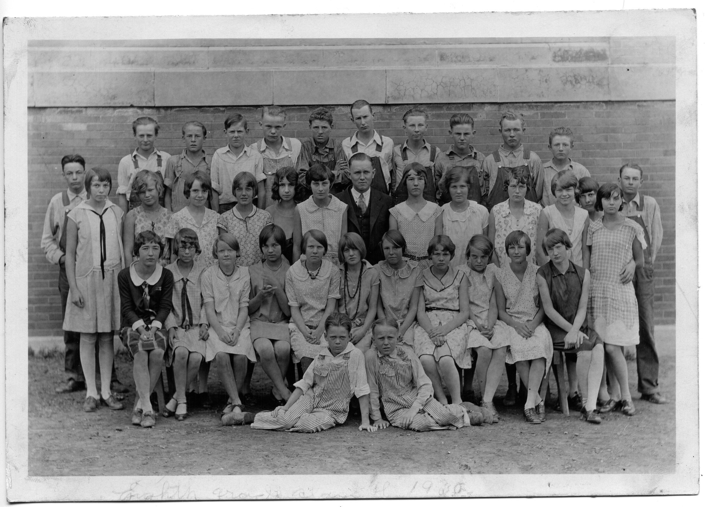 Back row, left to right, Raymond King, George Hayes, Howard Flint, Newell Barnes, Wendell Barton, George Yaunt, Myron Marston, James Prigmore, Bill Love, Roy Kanuit; Middle row, left to right, Herman Blamires, Eva Sandal, Ruby Rasmussen, Mary Bonnemore [sic - Bonnemort], Gertrude Rushforth, Luella Phillips, Elaine Hyde, teacher Elburn Dickson, Lucille Layton, Elaine Barton, Nora Wilcox, Sarah Linford, Bertha Butcher, Verla Smith; Front row, left to right, Mary Green, Vera Winegar, Juanita Young, Laven [sic - Lavern] Jost, Lavinia Young, Phyllis Payne, Vera Colemere, Jenny Beesley, Florence Buckly, Iwa Layton, Fern Galbraith. Sitting in front, Bill Epperson, Myron Linford