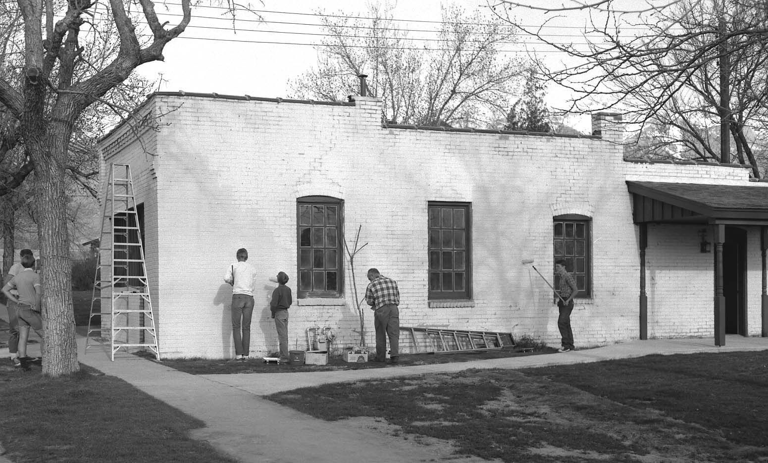 People working and painting the outside of LeConte Stewart's art gallery before opening.Photograph Details