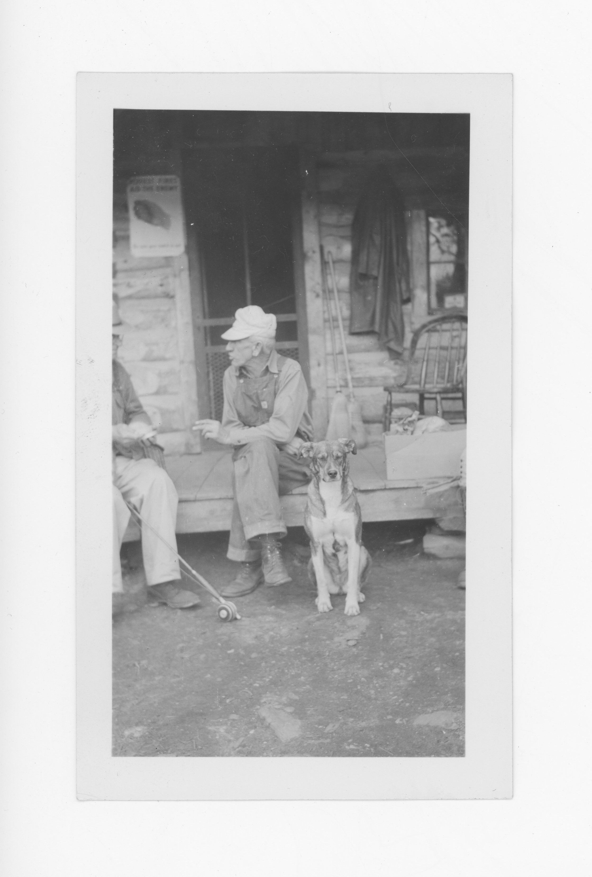 Two men holding fishing poles with a dog sitting on the ground. Kaysville natives, Frank Hyde, left, and Frank Schofield, right, relax on porch of Schofield's lodge at Spirit Lake.Photograph Details