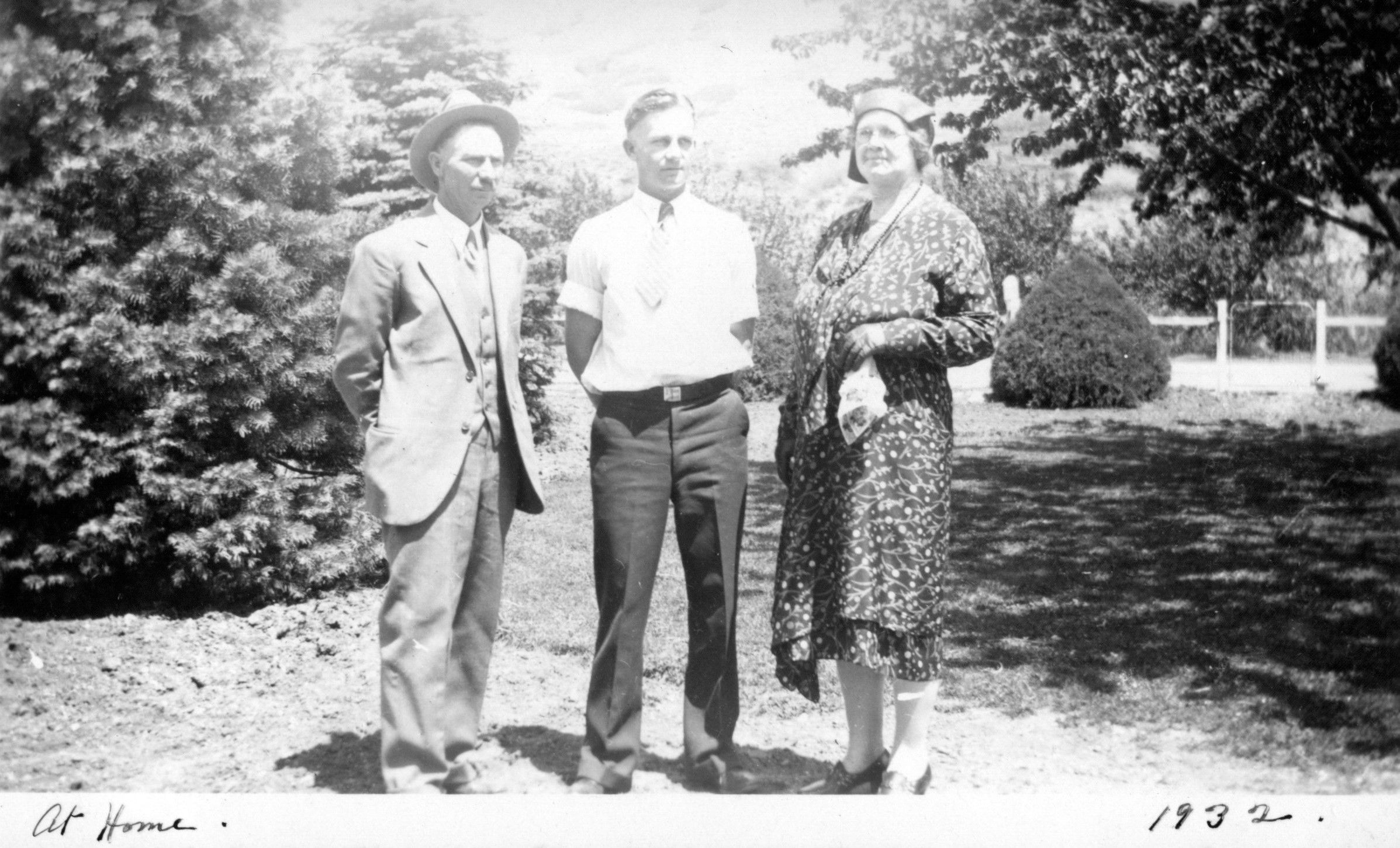 Butcher family members standing outside home on west side of old Mountain Road. L to R: Arthur Butcher, Carl Butcher, Martha Rushforth Butcher.Photograph Details