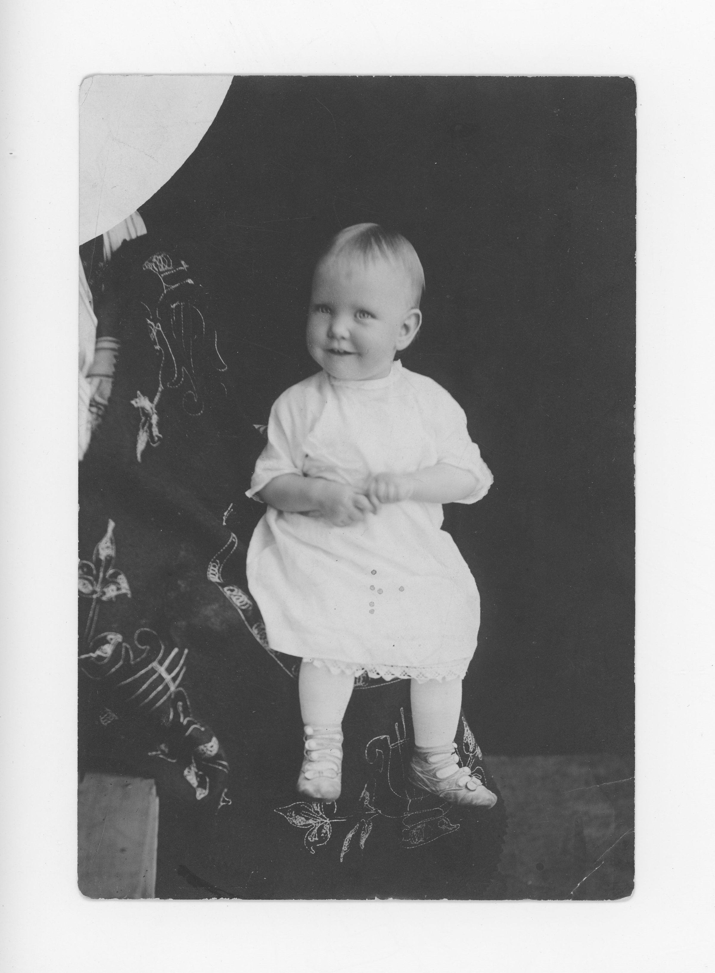 Portrait of young child sitting and wearing white dress.