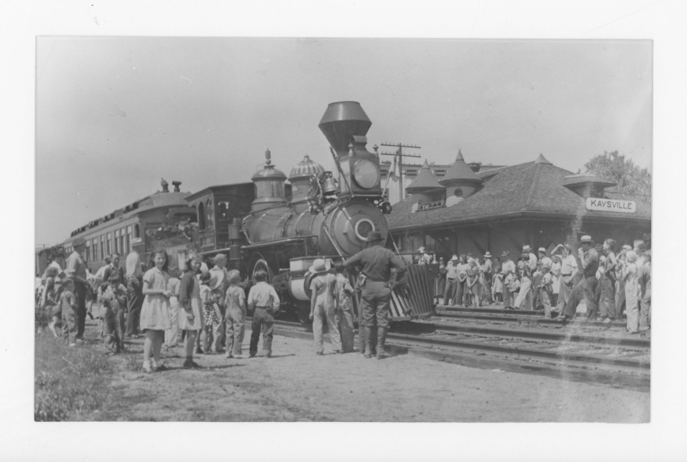 This picture was taken in 1944 on the 75th anniversary of the Union Pacific Railroad entering the Salt Lake Valley. The steam train seen in this picture was a replica of the 1869 engine and passenger cars. This train traveled across the United States as a promotional advertisement for railroad travel and to celebrated the U. P. Railroad's Diamond Jubilee. The man in front of the engine (view of his back) is Frank Williams and the little girl at the left looking at the photographer is Carol Parker. Both townspeople and grade school kids were at the Kaysville depot when this train moved through Davis County from Ogden to Salt Lake City. It stopped in Kaysville for a half an hour.