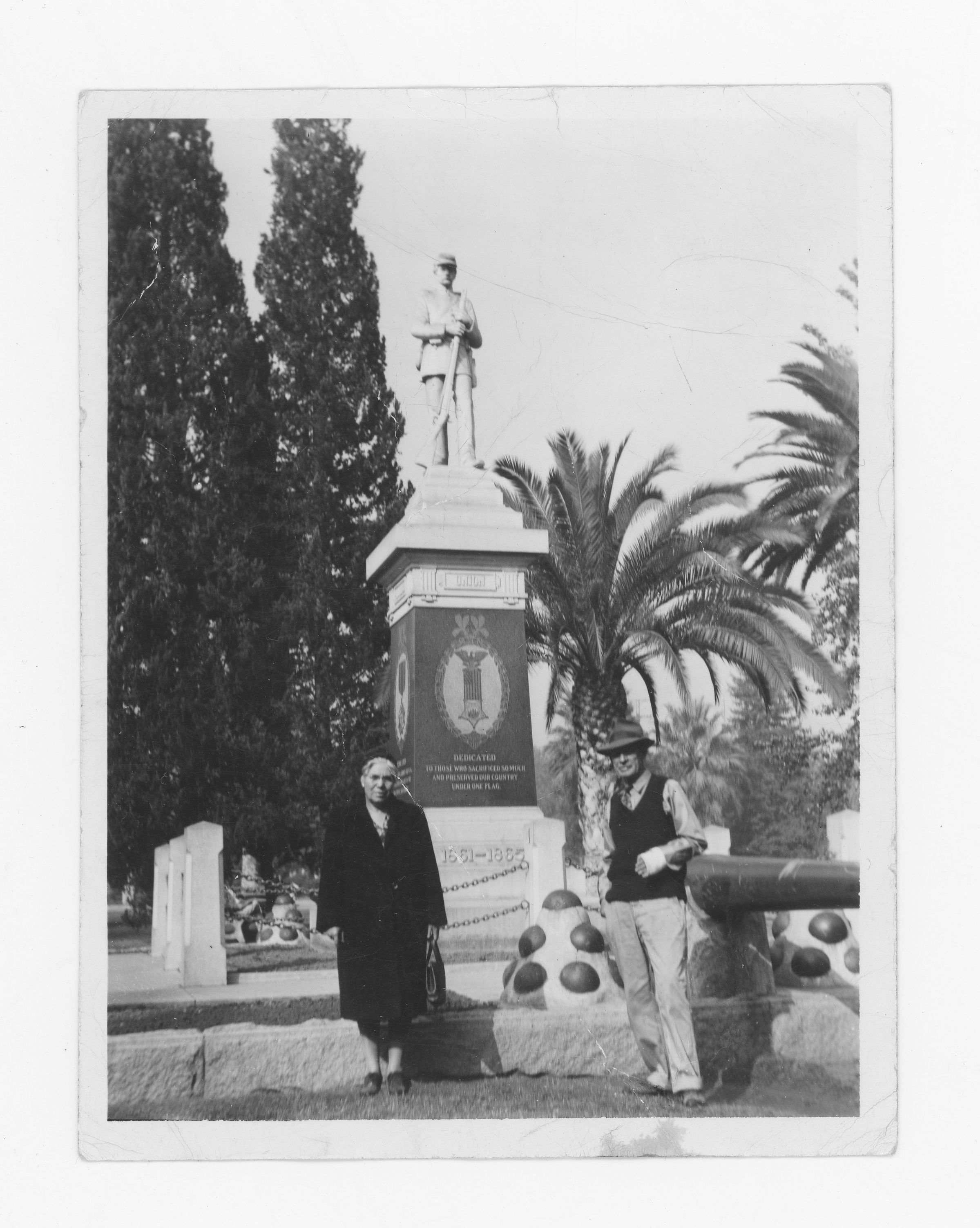 A man and woman standing beside the Mormon Battalion Monument in San Bernadino, California.Context