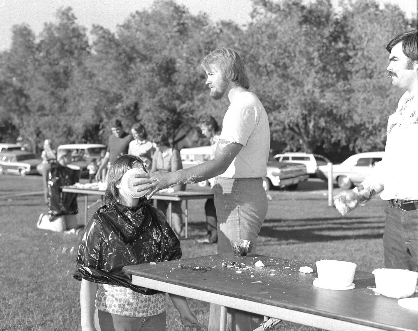 Man putting a plate of whipped cream into a young girls face at the bicentennial celebration.Photograph Details