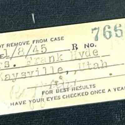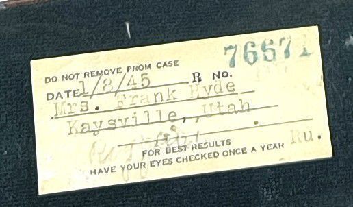 The Optical Shop 914 Boston BLDG. Salt Lake City do not remove from case Date 1/8/45 R no. 76671 Mrs. Frank Hyde Kaysville, Utah For best results have your eyes checked once a yearLanguage