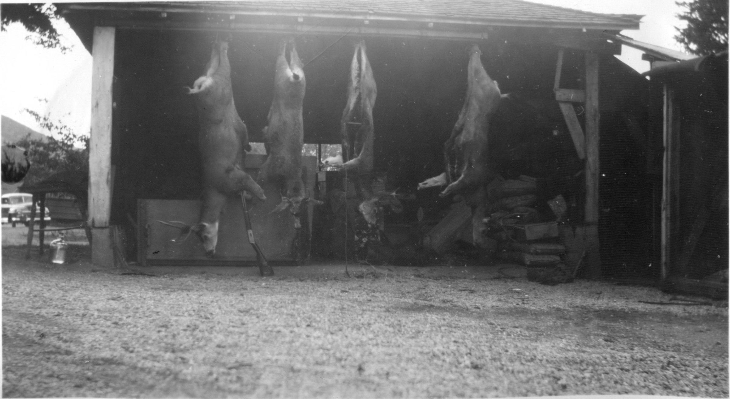Four deer carcasses hanging from ceiling of Butcher family outbuilding.