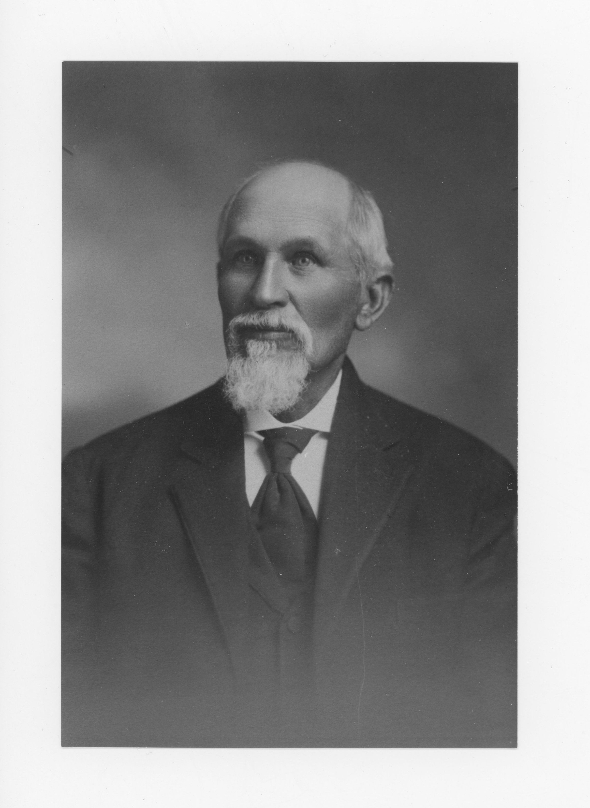 Portrait of old man with a white beard wearing a dark suit jacket and tie. Probable Kaysville resident.