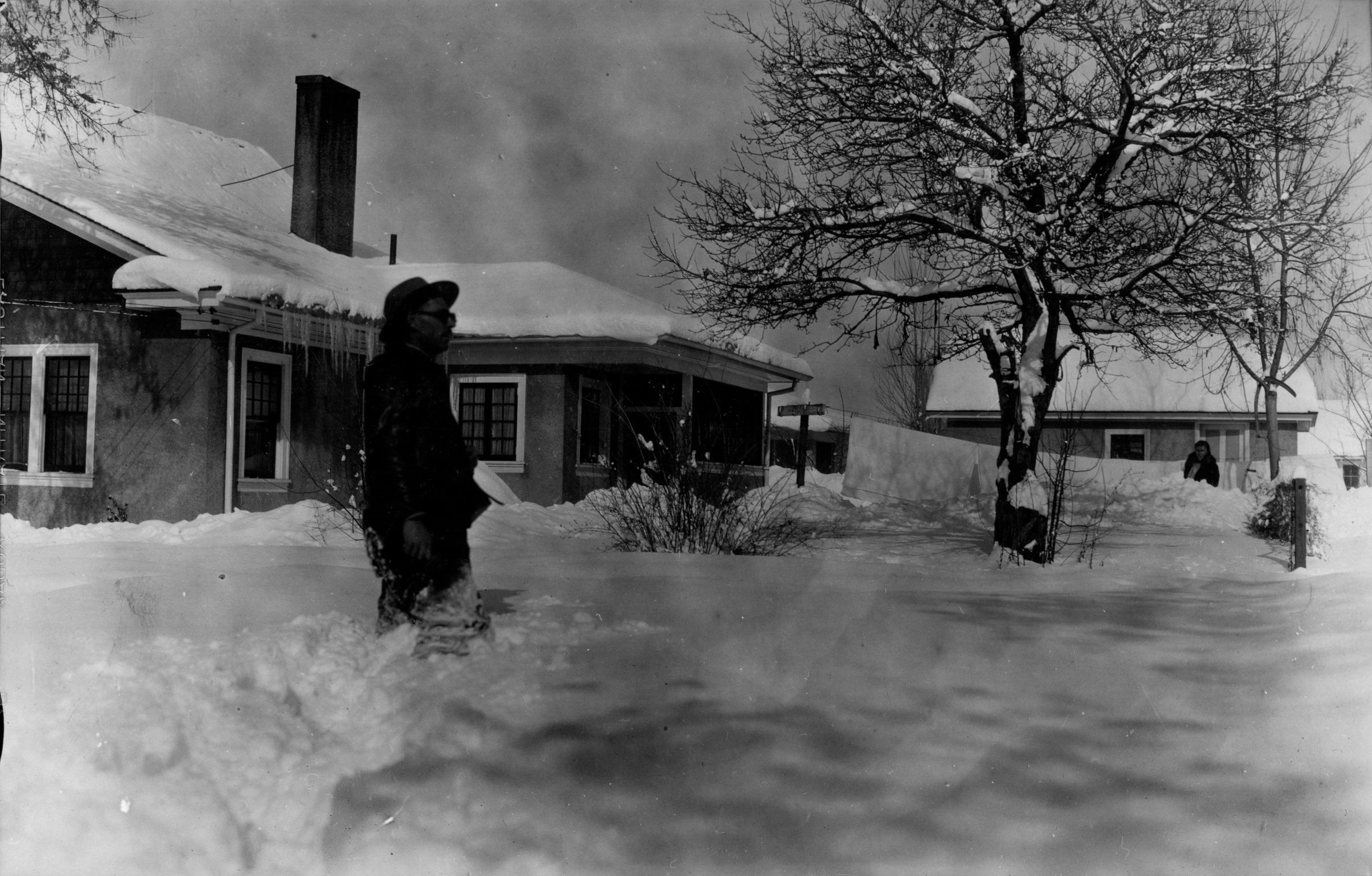 Lester Gleason standing on the east side of W. P. Epperson's Kaysville house in winter.Photograph Details