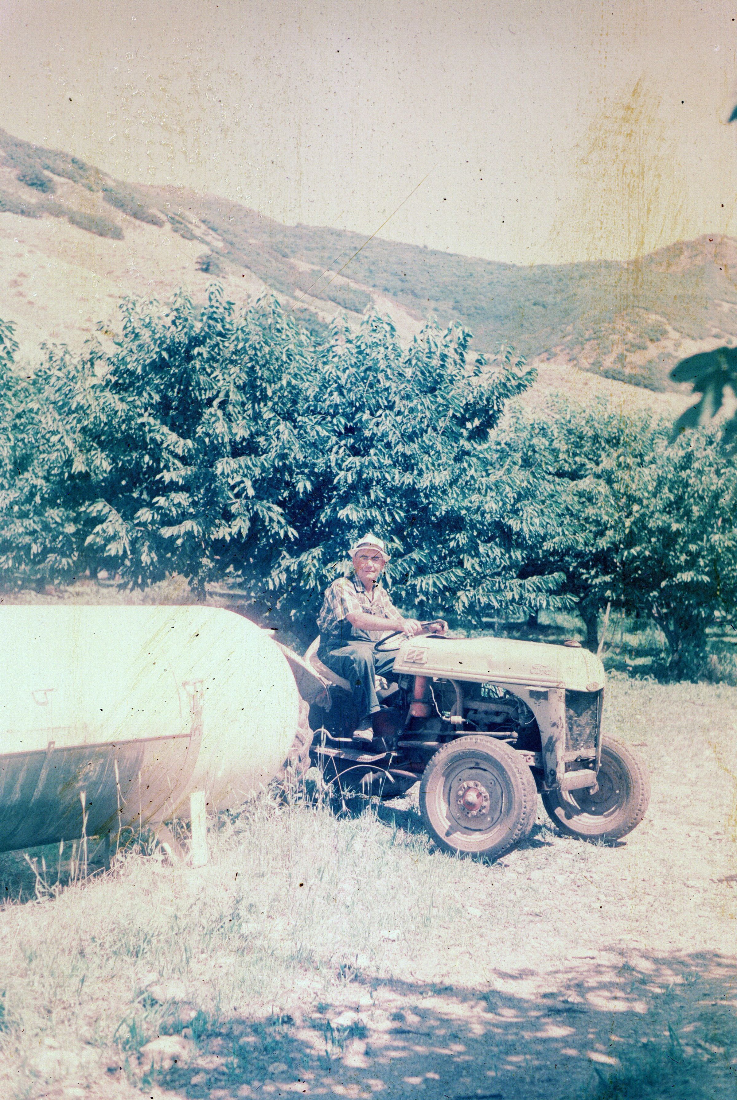 Alden Burton seated on tractor in his Fruit Heights orchard.Photograph Details