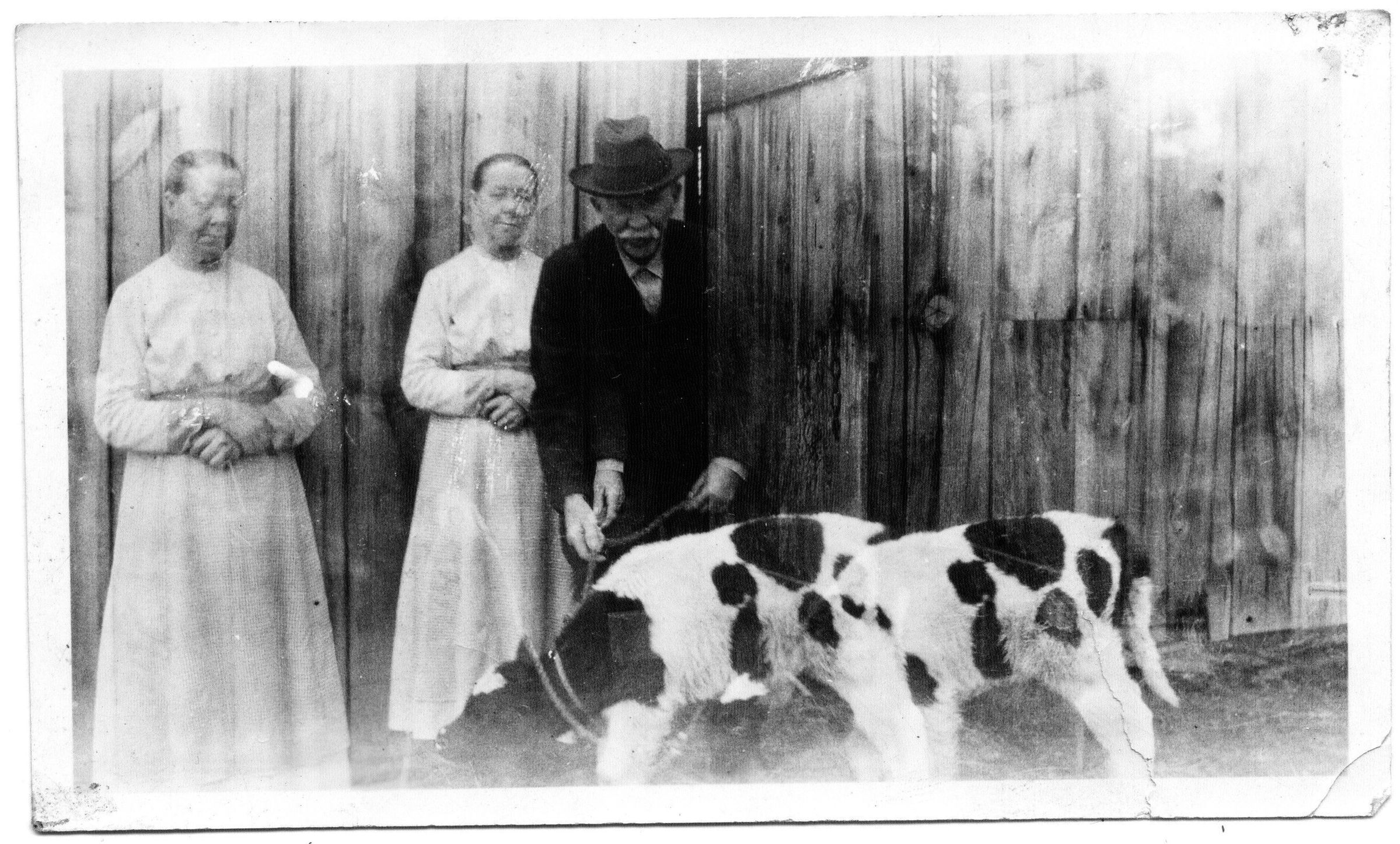 Charles and Lucy Barnes. Charles has a calf on a rope. All are standing in front of a barn in Kaysville.Photograph Details
