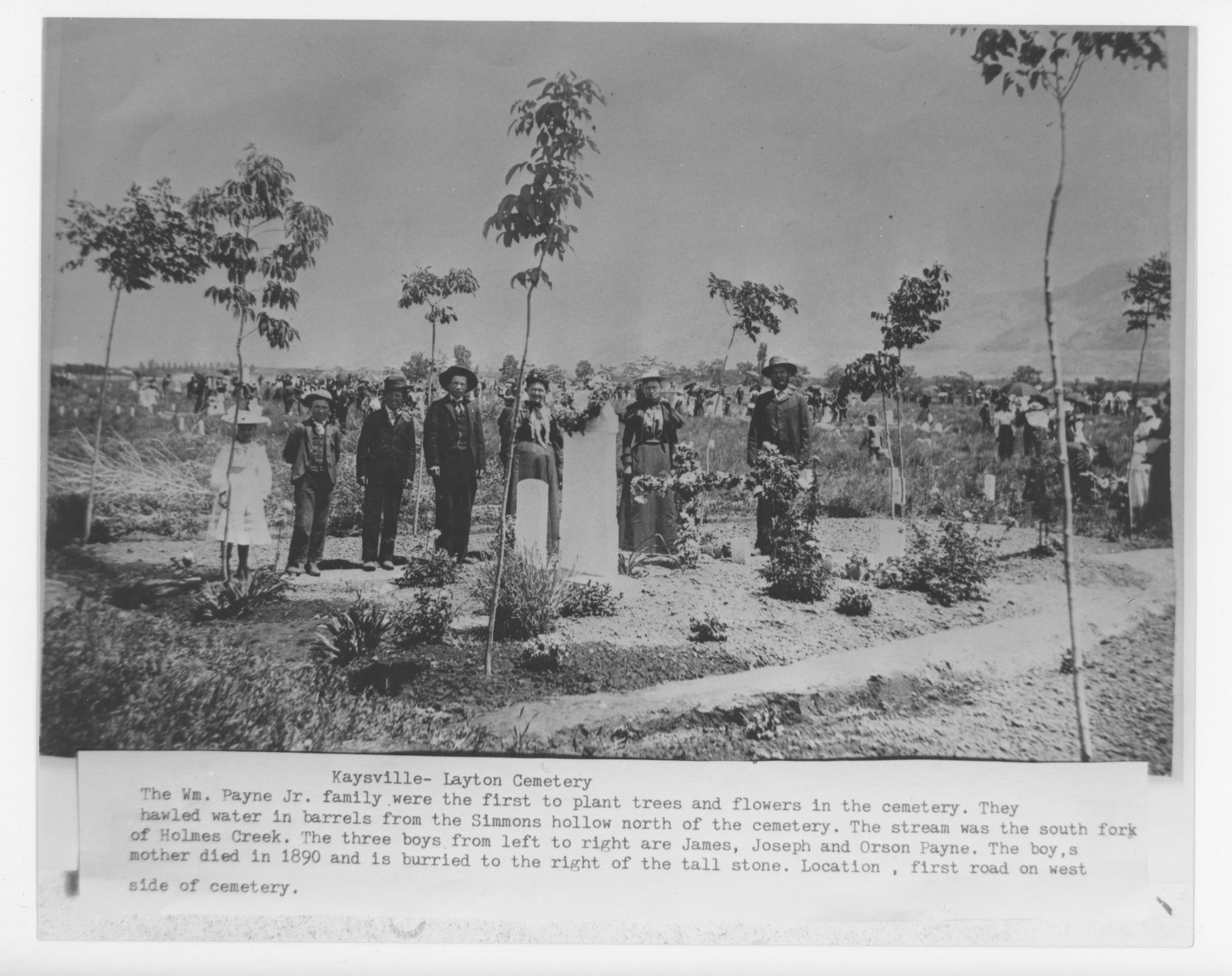 Kaysville- Layton Cemetery The Wm. Payne Jr. family were the first to plant trees and flowers in the cemetery. They hawled water in barrels from the Simmons hollow north of the cemetery. The stream was the south fork of Holmes Creek. The three boys from left to right are James, Joseph, and Orson Payne. The boy,s mother died in 1890 and is burried to the right of the tall stone. Location , first road on west side of cemetery.
