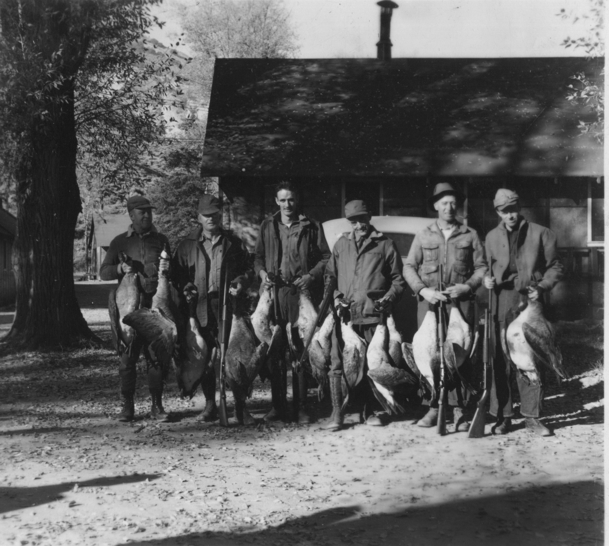 Civilian Conservation Corps employees stand in front of a cabin while holding geese shot during hunt.Photograph Details