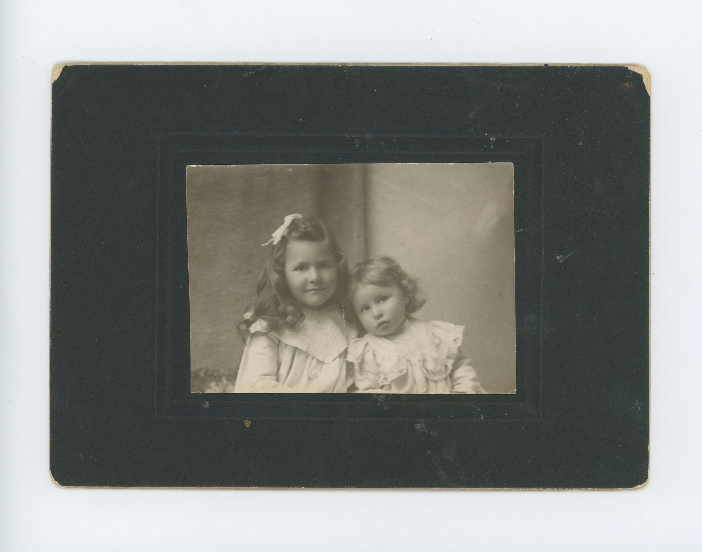 Two young girls wearing white dresses sitting together.Photograph Details
