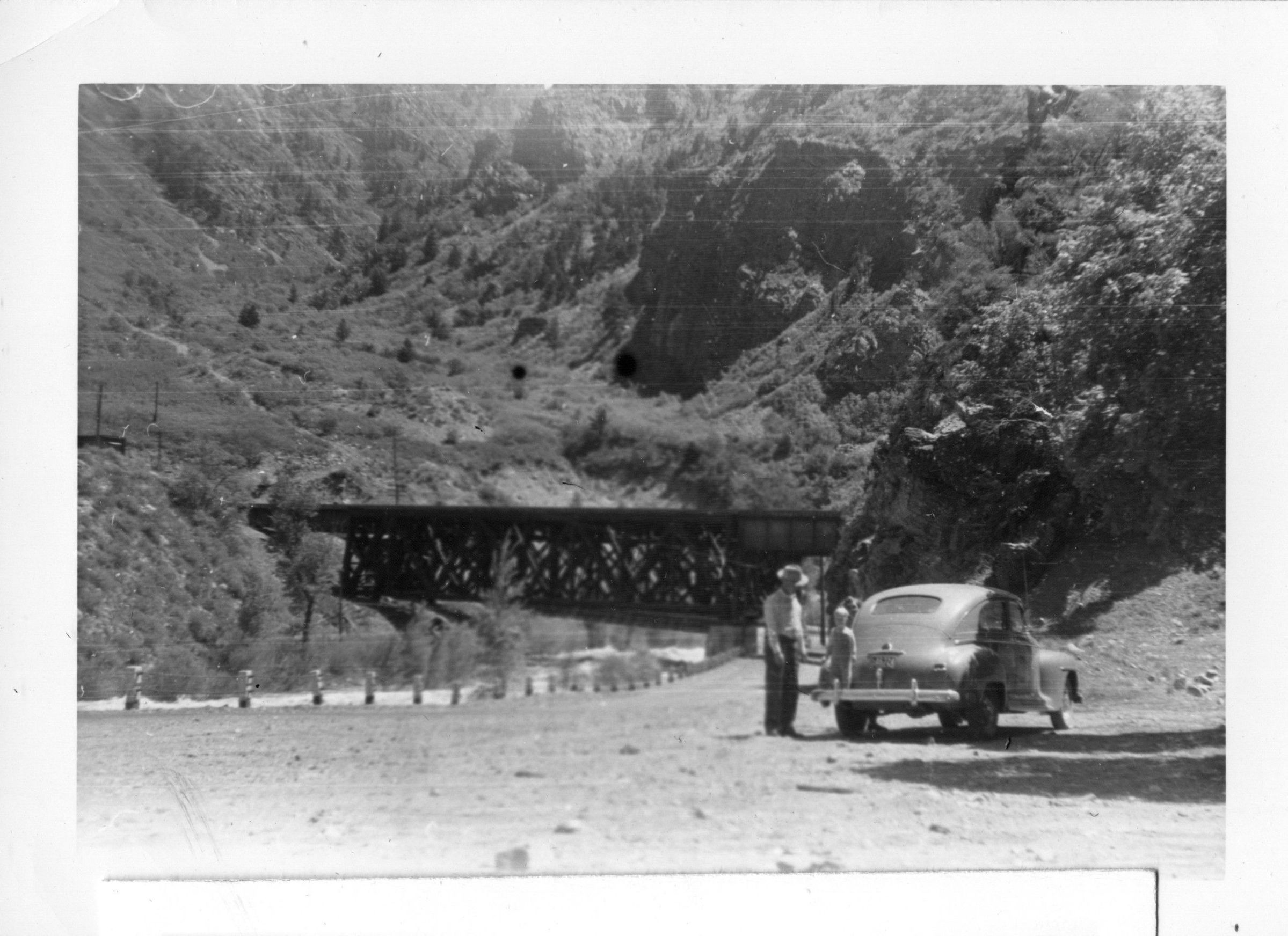 Carl Butcher with nephew Don Butcher beside car in Weber Canyon.Photograph Details