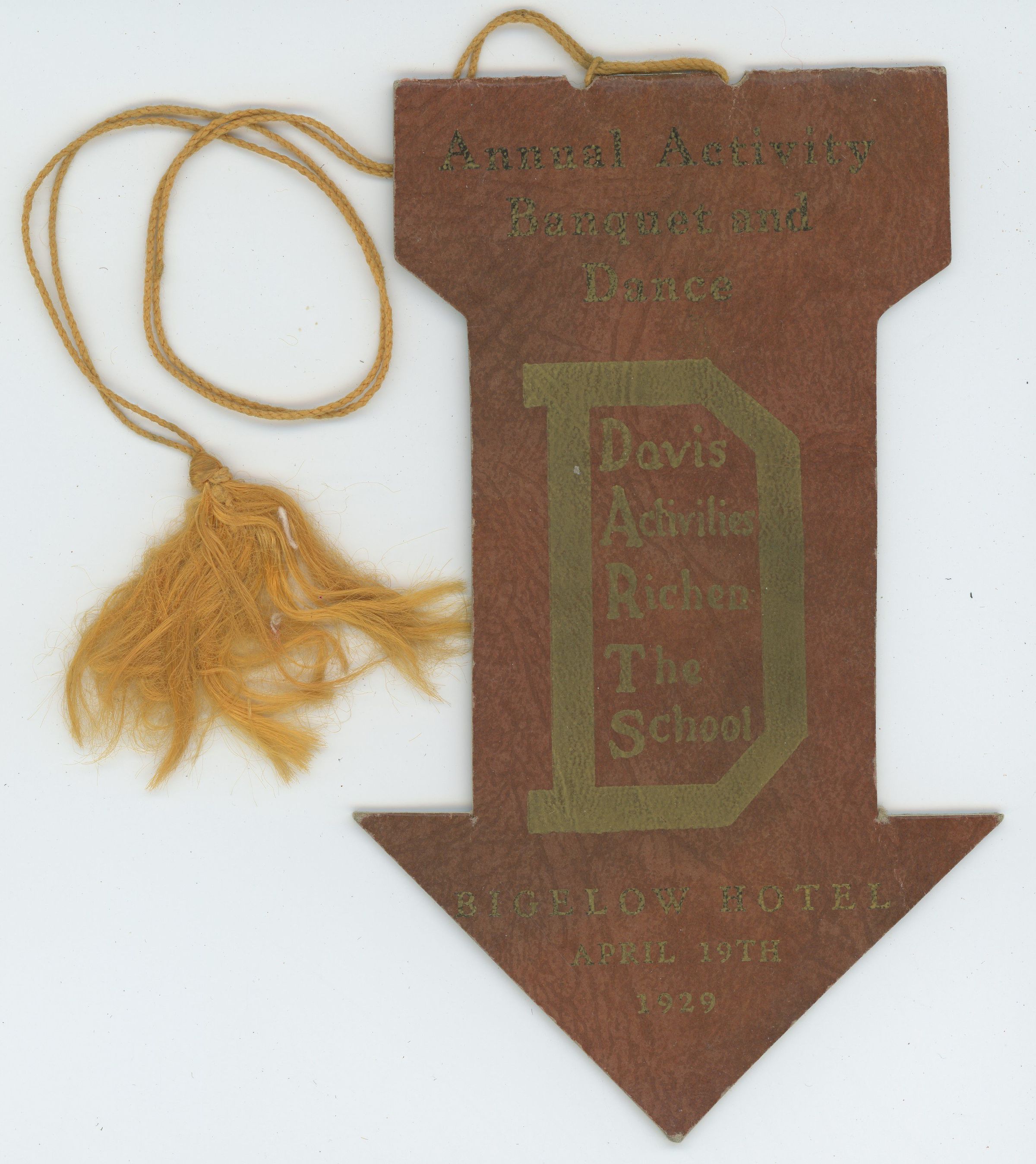 Dance card for an annual Davis High School activity, a banquet and dance. The dance took place in the Bigelow Hotel, April 19, 1929. The theme was Davis Activities Richen [Enrich] The School.Context