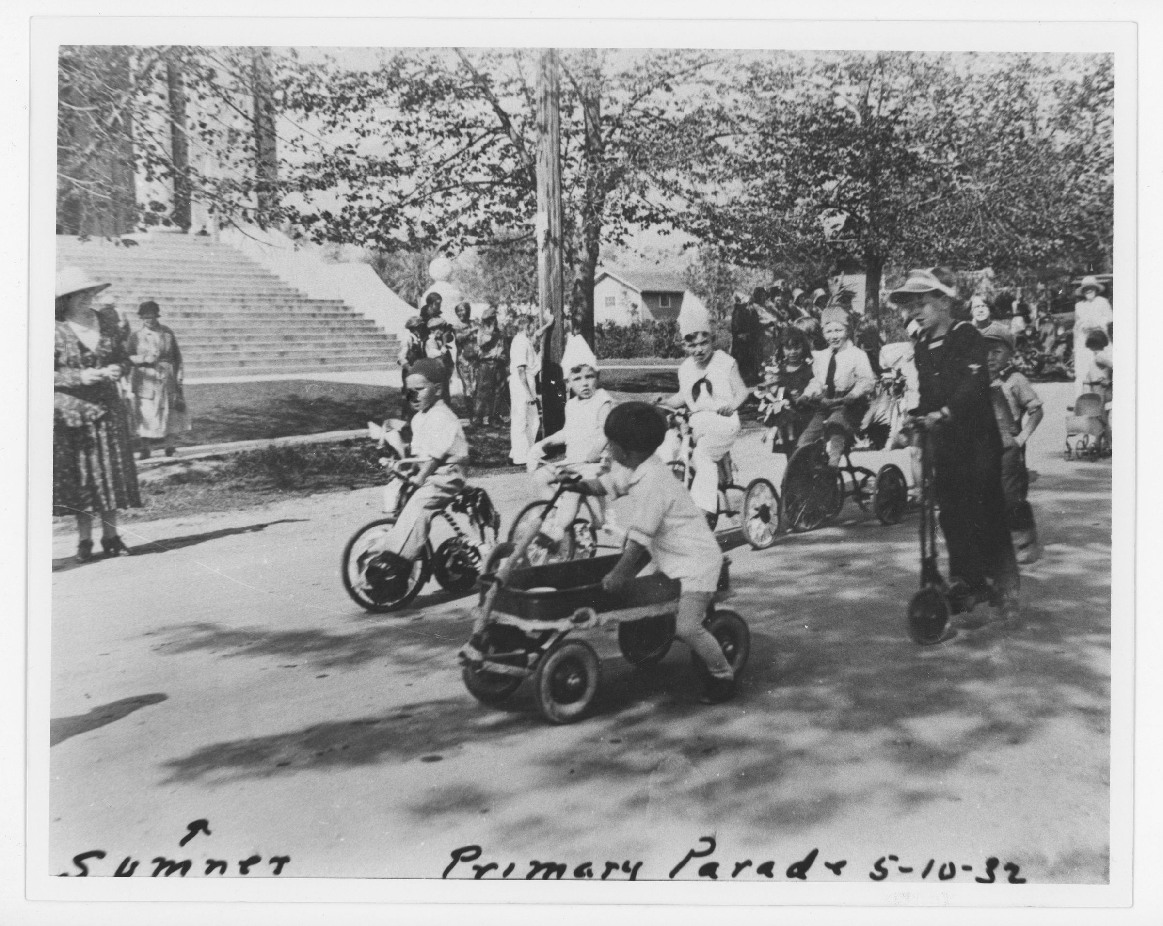 Trees, Stairs, Wagons, Tricycles, Scooters, Baby carriages, Children, Parades & processions, Grasses, Women, Groups of people, Dresses, Costumes, Neckties, Hats, Military uniforms