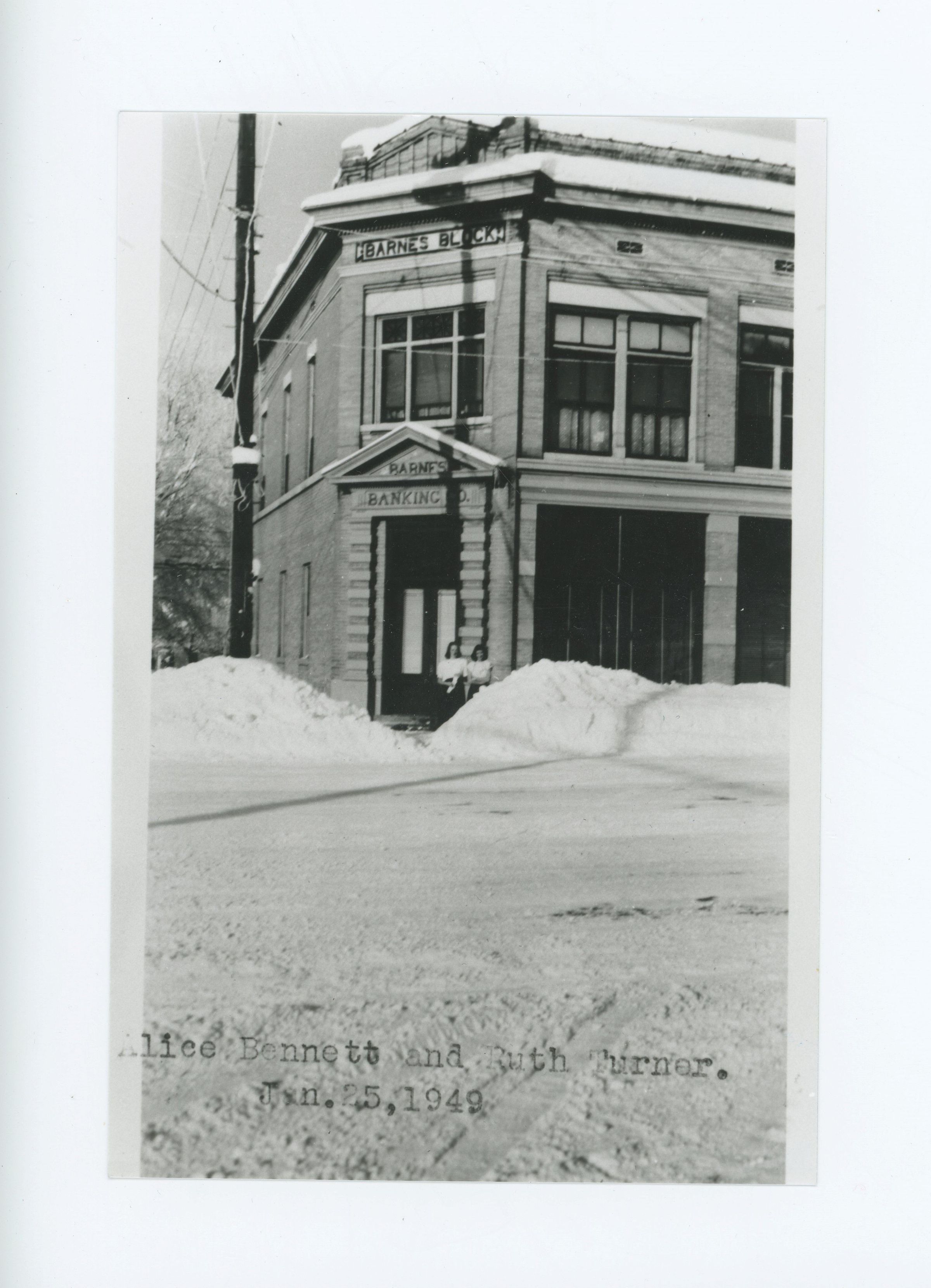 Bank clerks Alice Bennett and Ruth Turner standing outside Barnes Bank next to Kaysville's snow-covered Main Street.Photograph Details