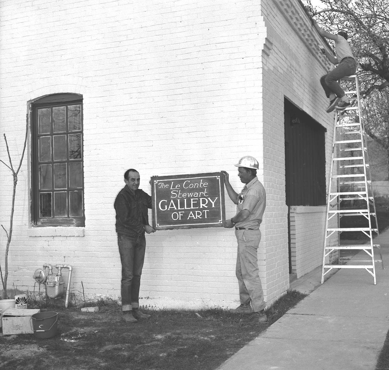 The sign for LeConte Stewart's Art Gallery, which was eventually replaced with a City Hall. Glen Cundall and Robert Iverson (contractor of the building remodel). Man on ladder unidentified.Collection