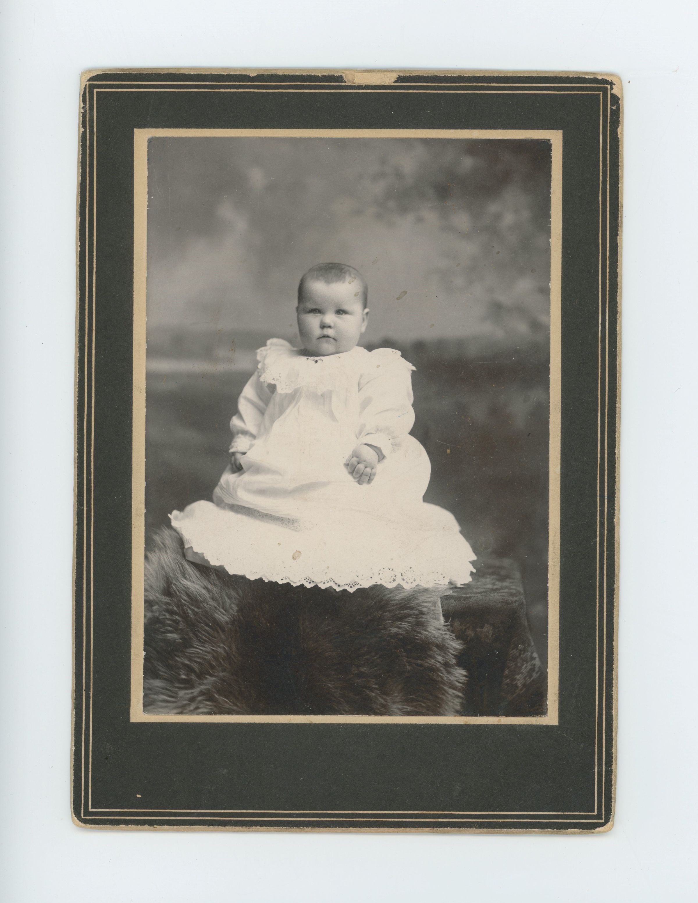 Portrait of young child wearing white dress.