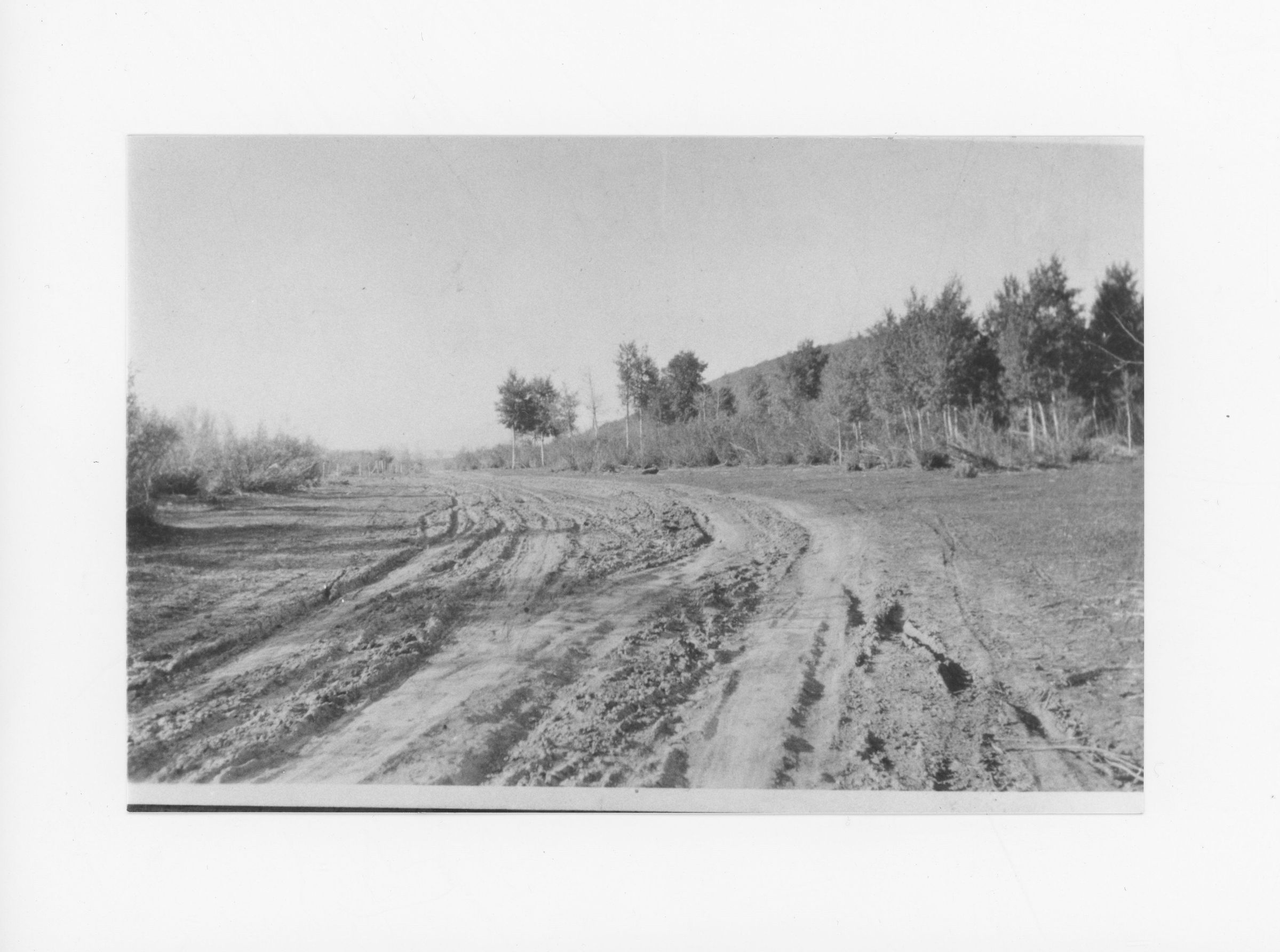 Muddy road with trees and a hill.Context