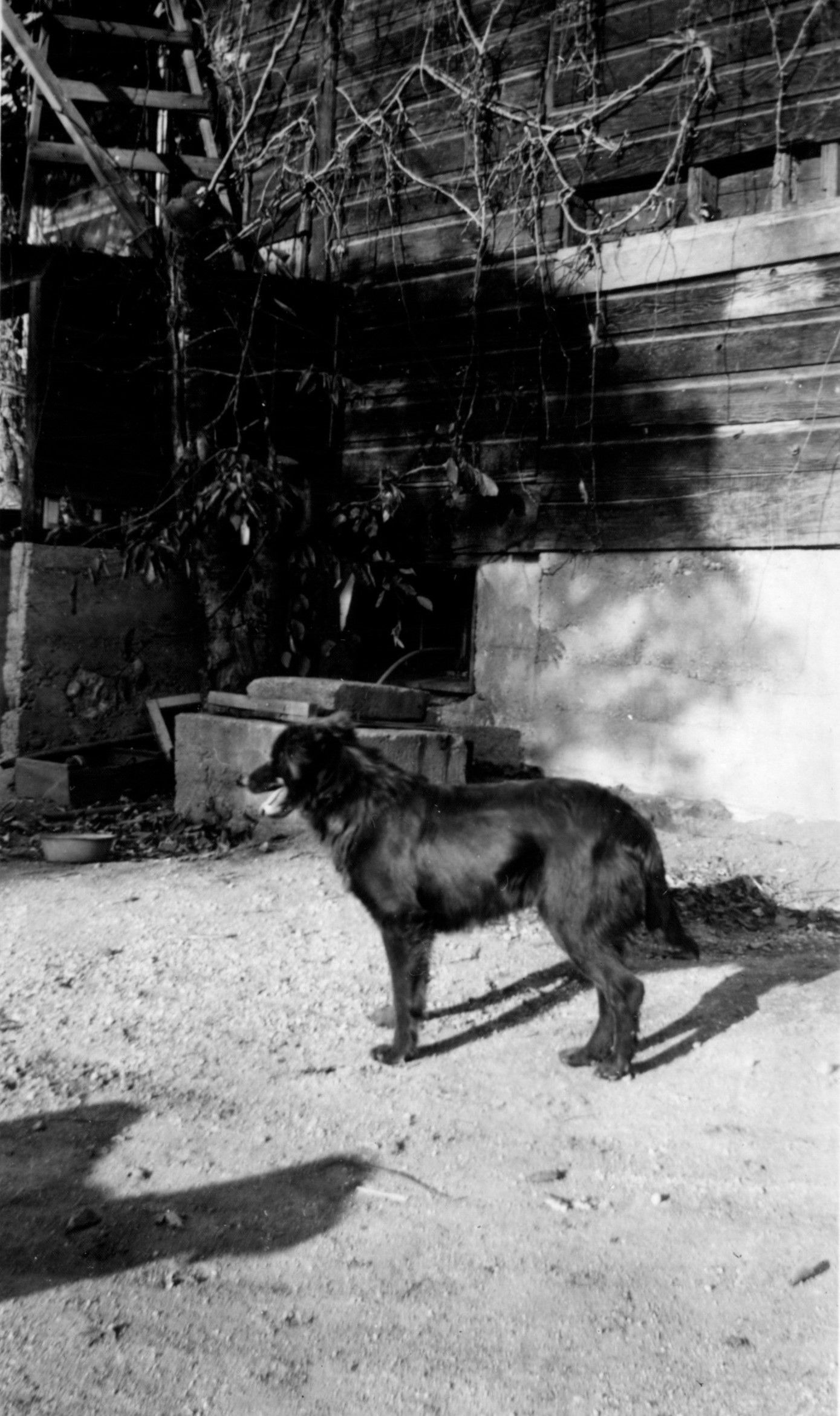 Black dog standing on dirt road next to Butcher hay barn.Photograph Details