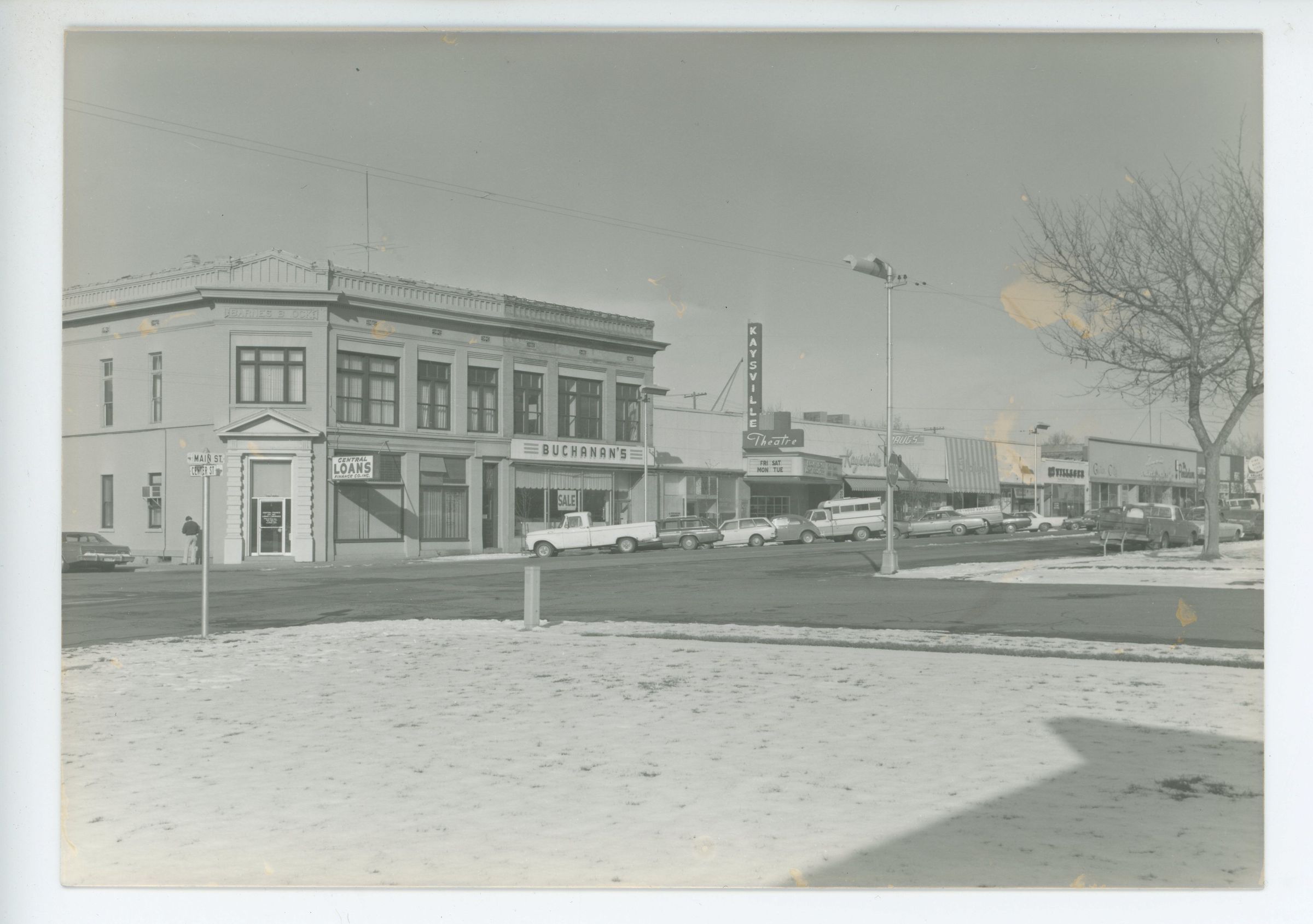 Kaysville street view of Barnes Bank Block, Buchanan's, the Kaysville Theatre, and Kaysville Drug store.