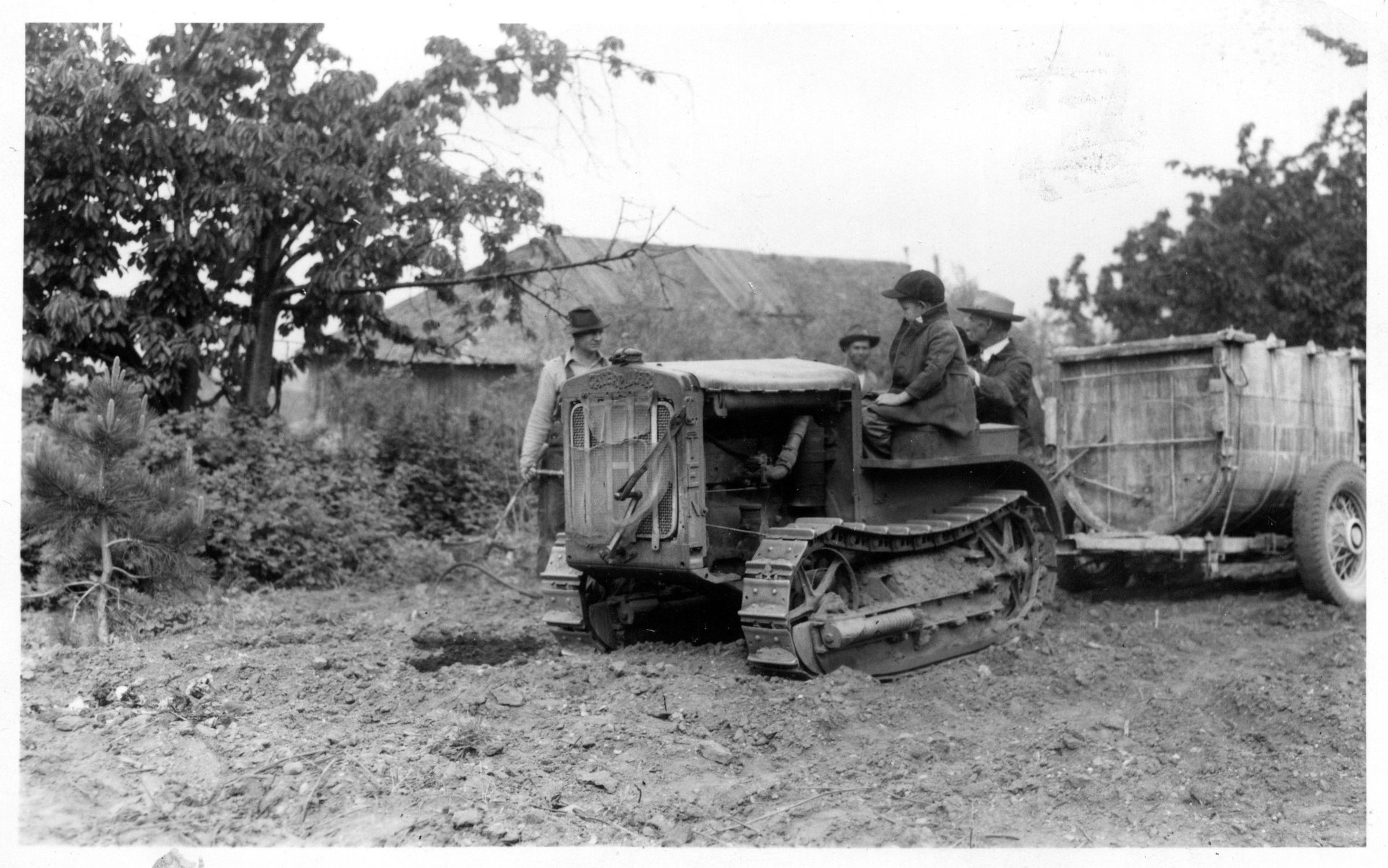 Butcher barn in background. Individuals are likely members of Butcher family. Rocky mountainside soil required heavy machinery for orchard farmers. Butcher family are descendants of William and Emma Wheatley Butcher, early settlers to east Kaysville.Collection