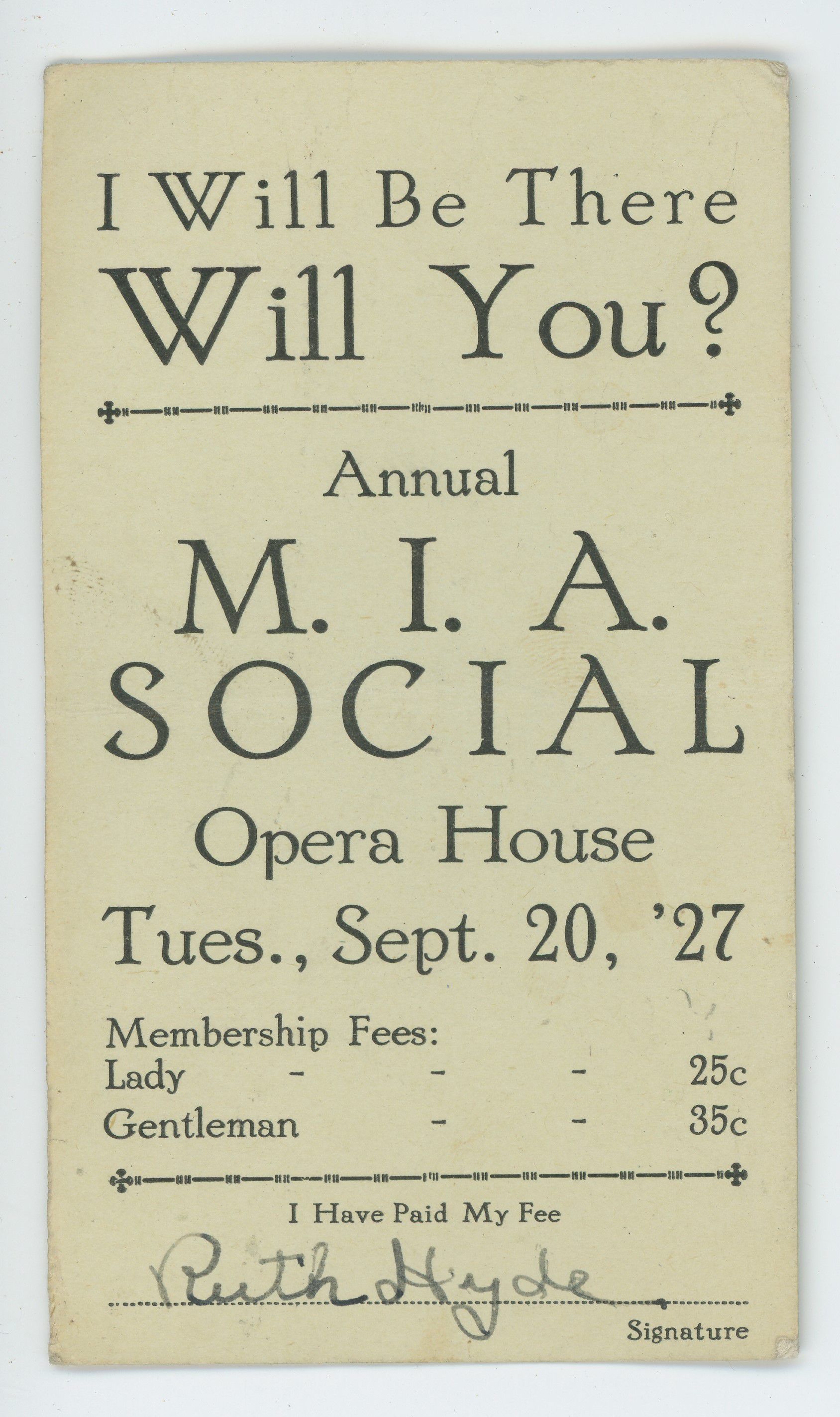 Ticket for the Davis Stake L.D.S. M. I. A. (Mutual Improvement Association) activity of September 20, 1927.Context