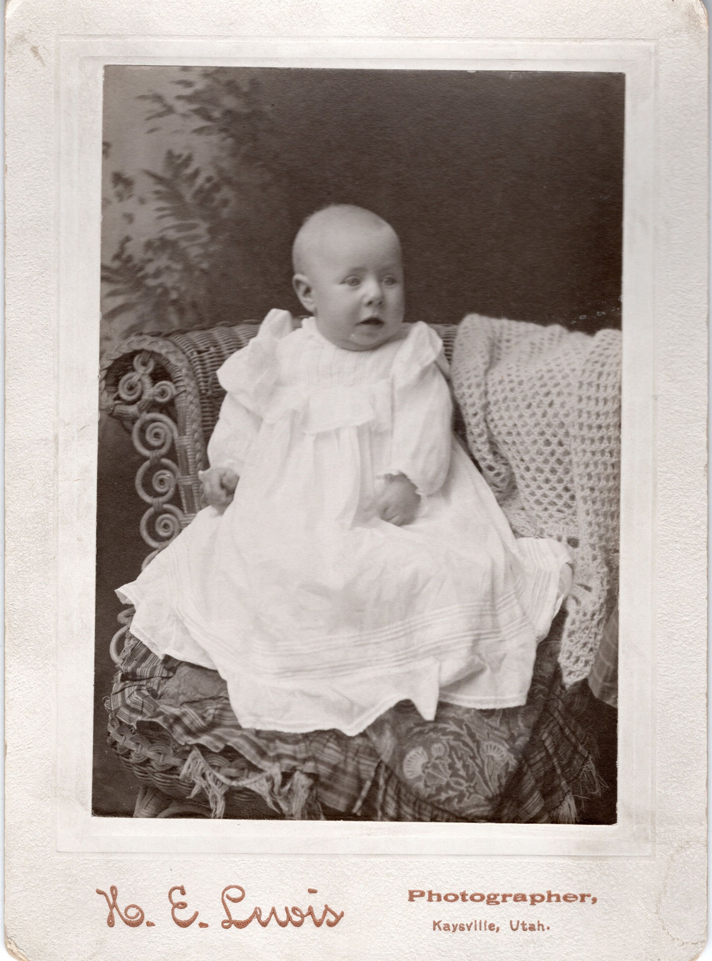 Photograph of baby, possibly August Lewis, seated on a wicker chair in Kaysville studio.Photograph Details