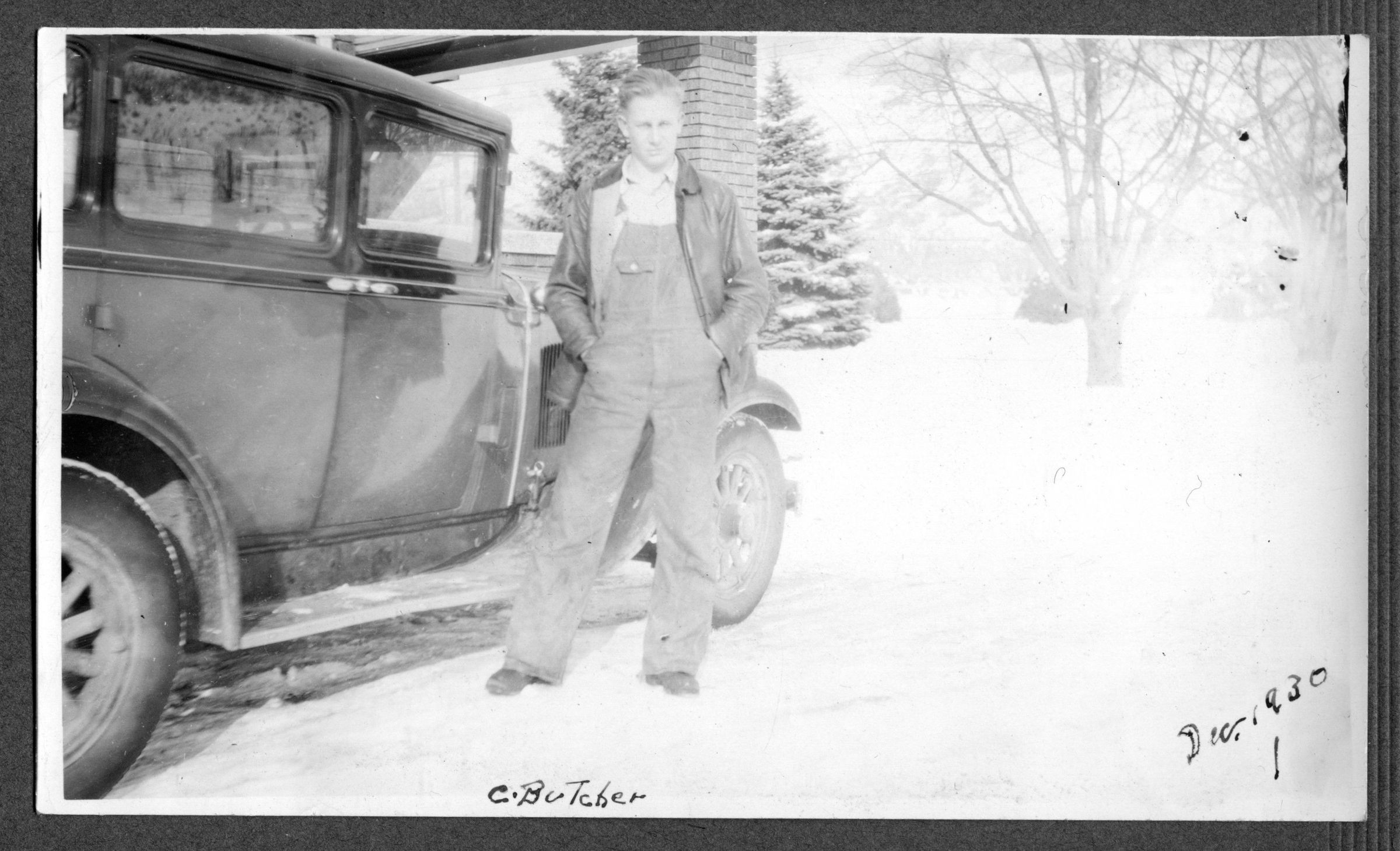 Carl Butcher standing in snow next to car at home on old Mountain Road.