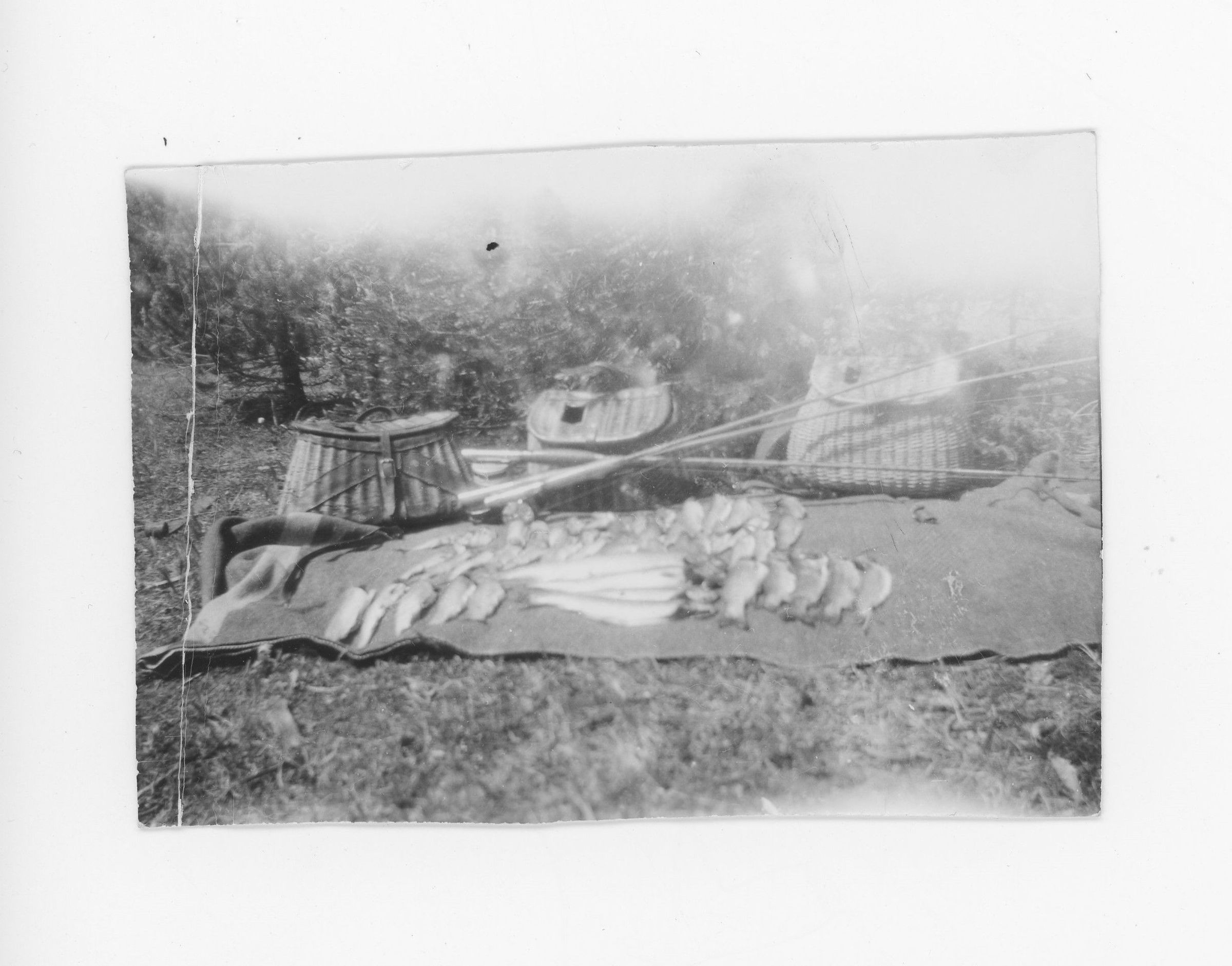 Many fish laid on blanket with fishing poles and three baskets.Photograph Details