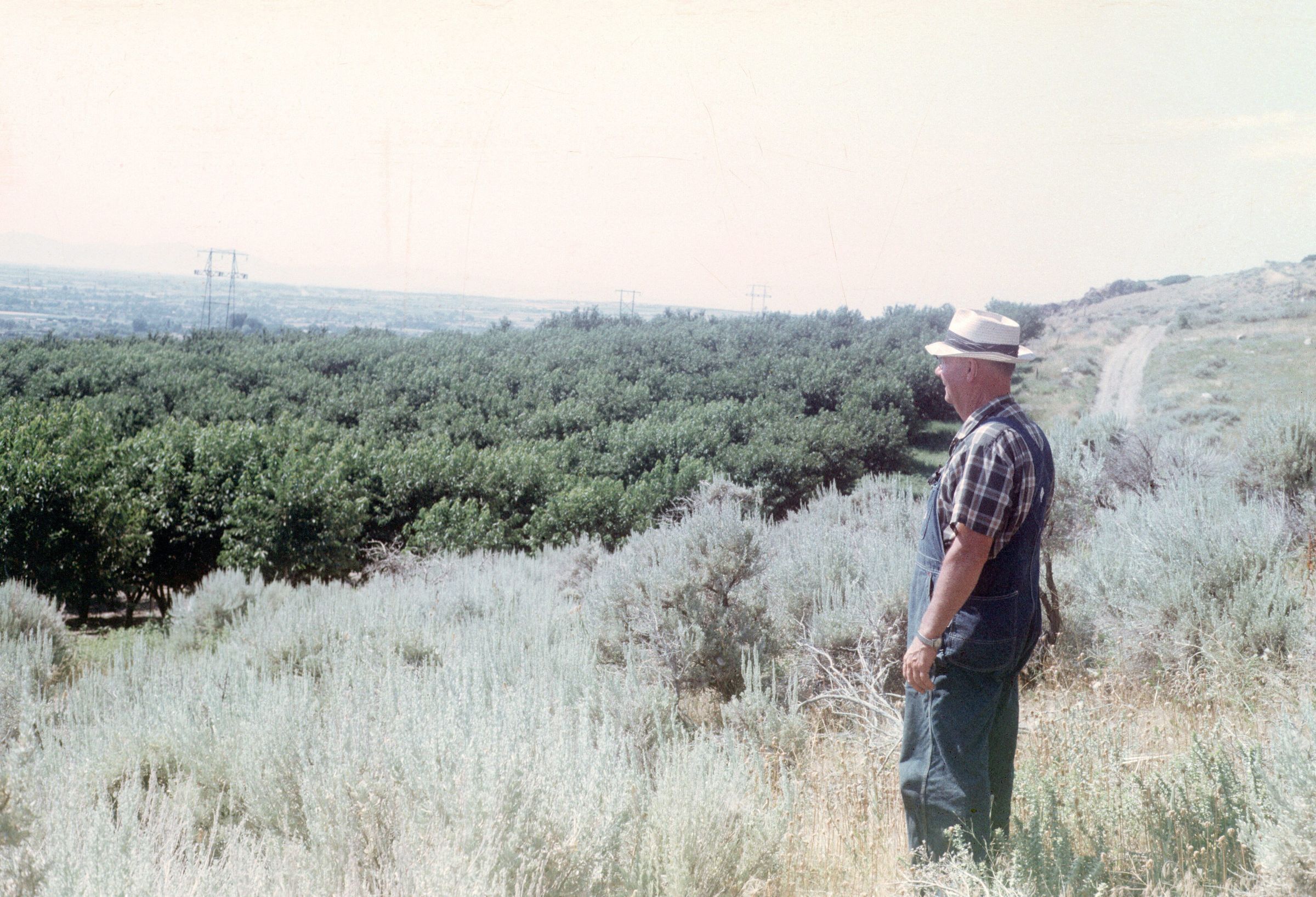 Alden Burton stands on sagebrush covered slope above his orchard in Fruit Heights.Photograph Details