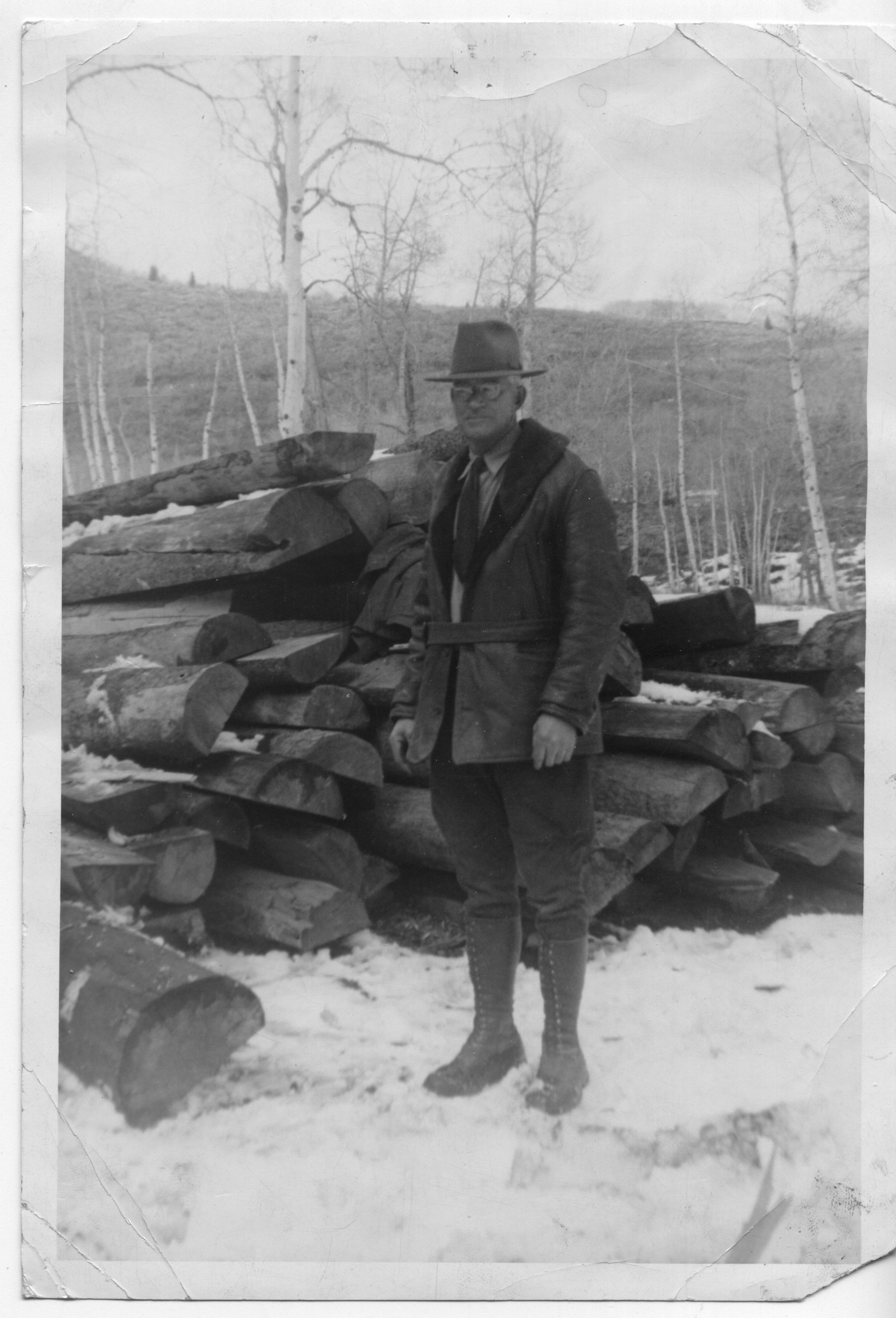 Frank Hyde stands near pile of logs in Uinta Mountains which will be used to build corduroy roads.Photograph Details