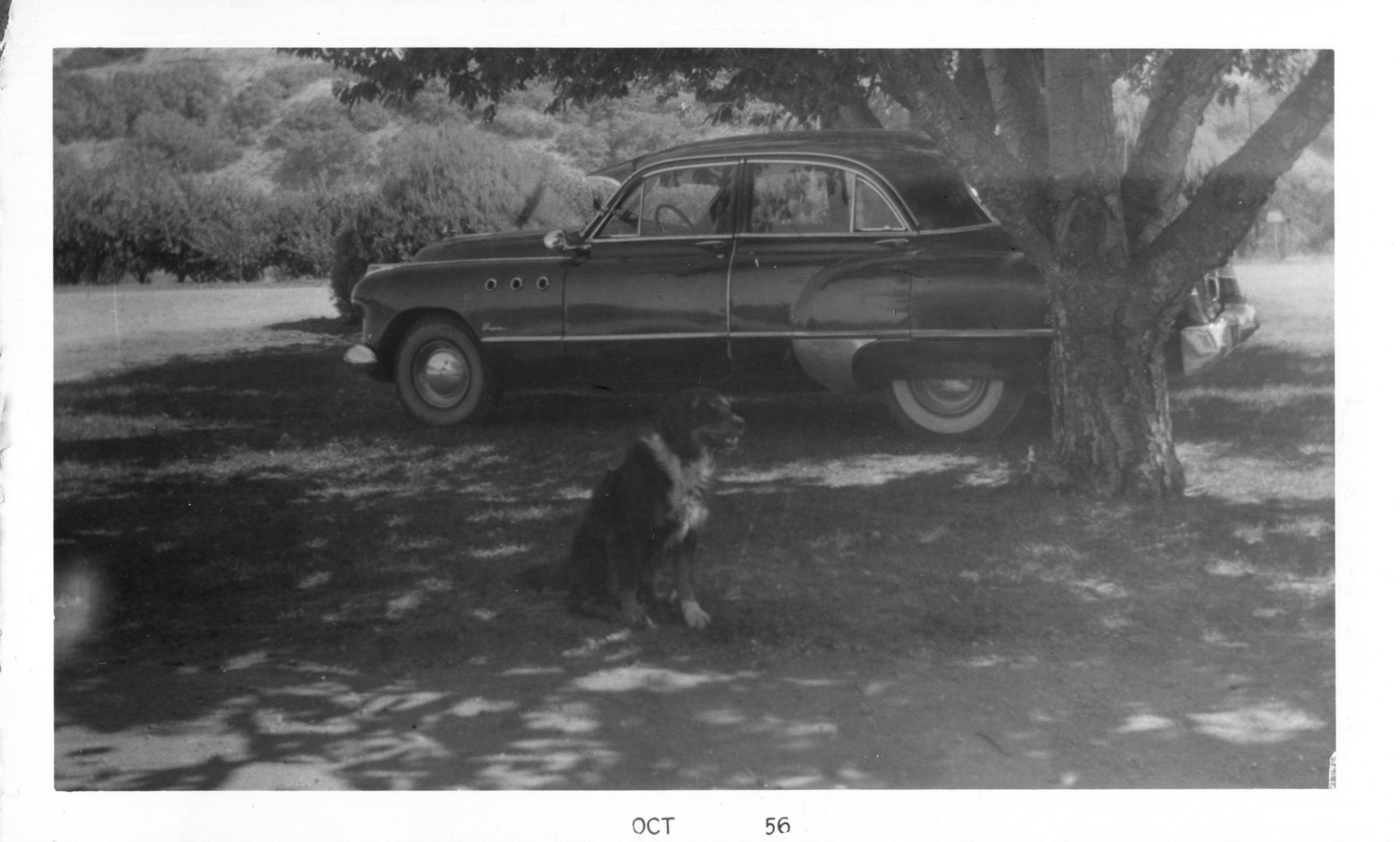 Dog sitting outside of a car on property belonging to Butcher family. Orchard trees in distance adjacent to mountain bench.