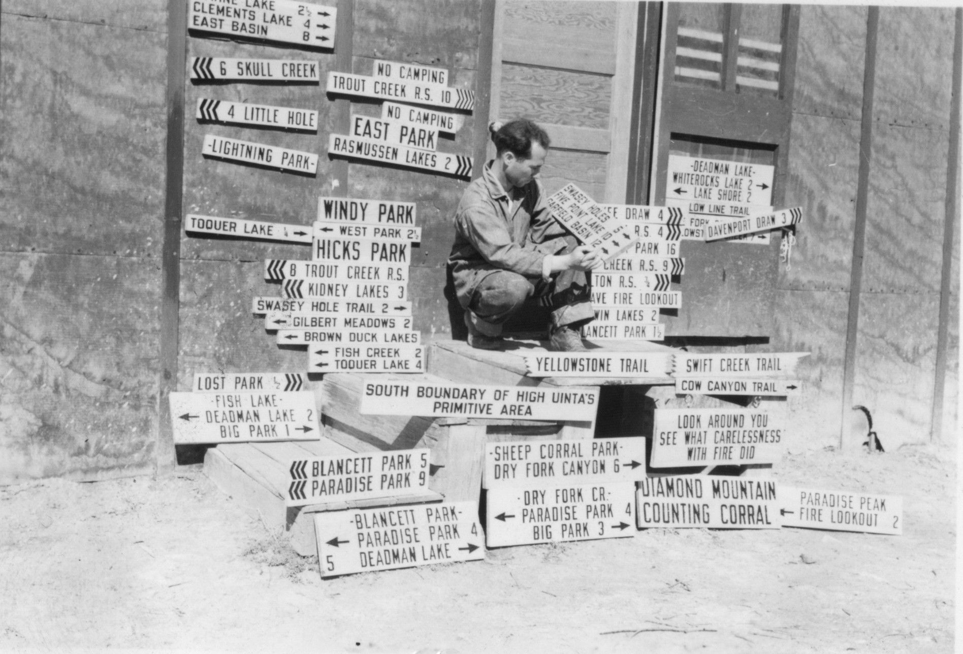 CCC employees completed work projects in the Uinta Mountains. One project was to create signs to various mountain locations are shown.Photograph Details