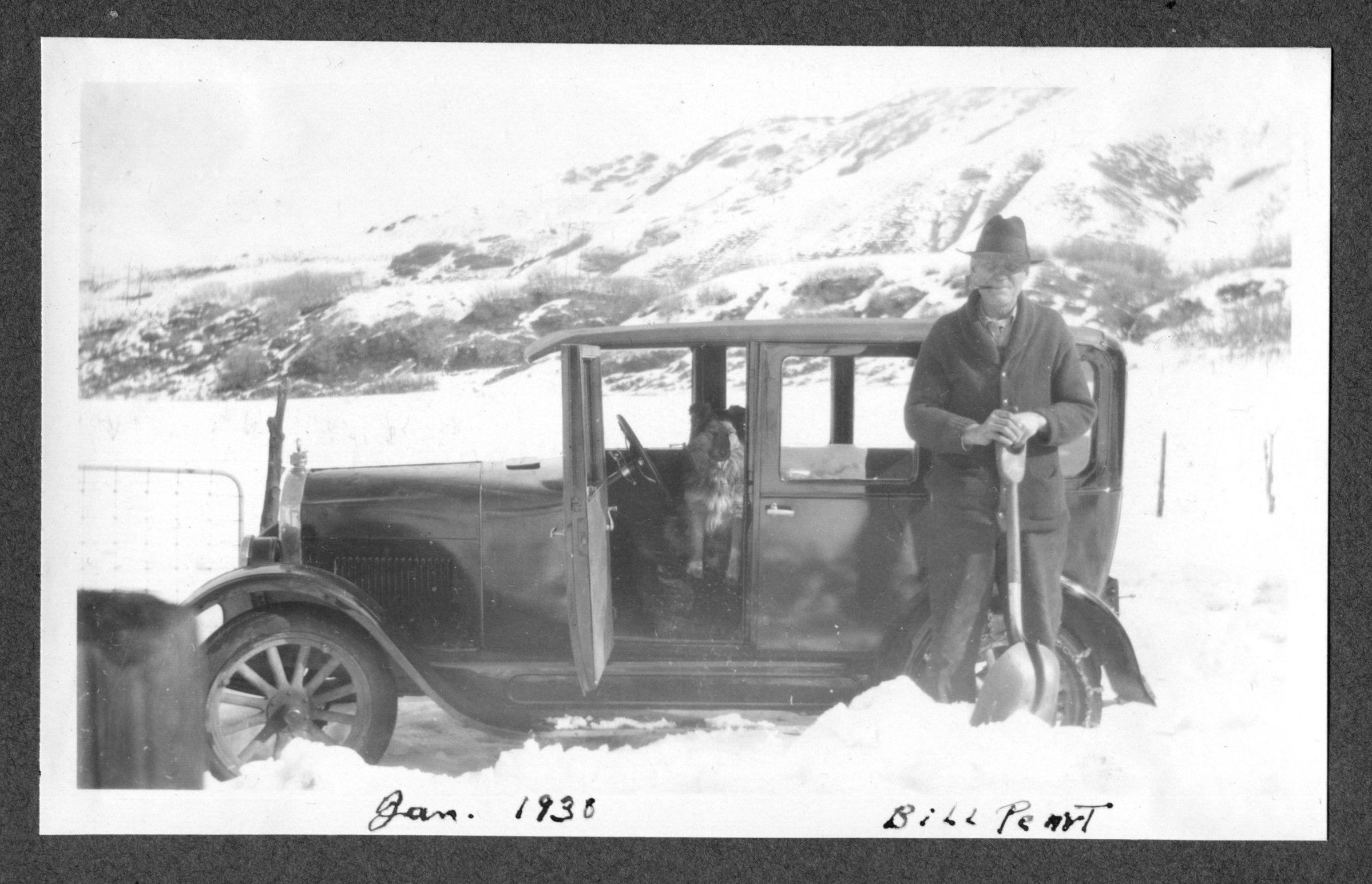 Bill Peart standing in snow next to car in what would soon be known as Fruit Heights.Photograph Details