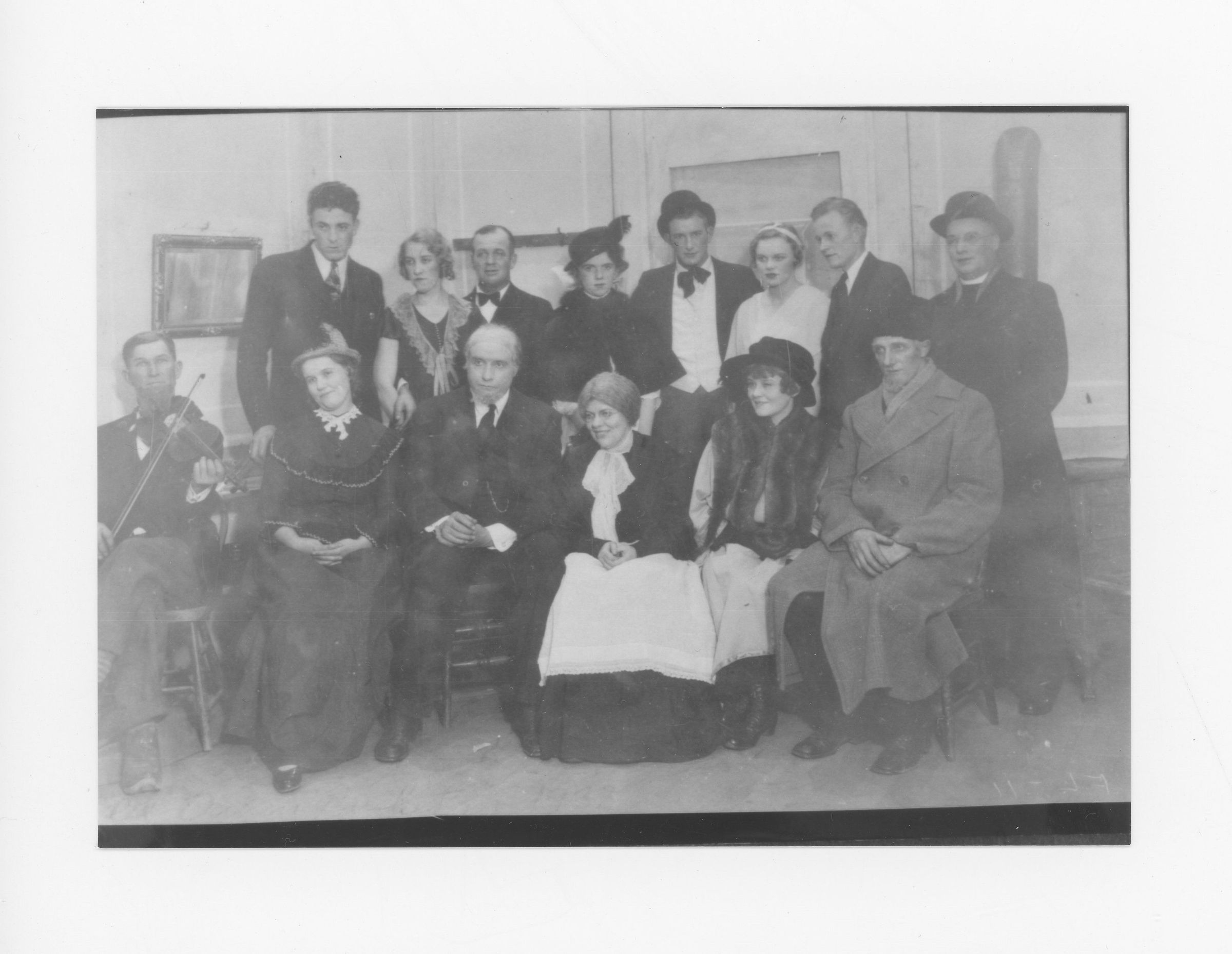 Cast of play "Three Live Ghosts:" (L-R) Front row: Daws Layton, Camella Barton, Albert Barton, Roetta Kilfoyle, Alice Thornley, Roy Webster,. Back row: Lynn Sandall, Mariam Whitesides, Myron Phillips, Mary Bowring, Harman Barton, Beth King, Seth Blood, Jack Barker. This group performed in the Kaysville Opera House.Collection