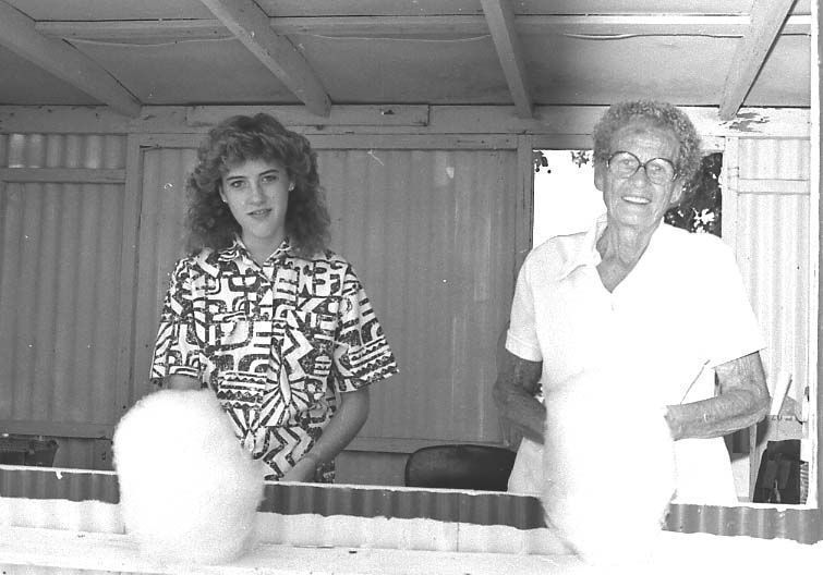 Twp women selling cotton candy trailer at the county fair.Photograph Details