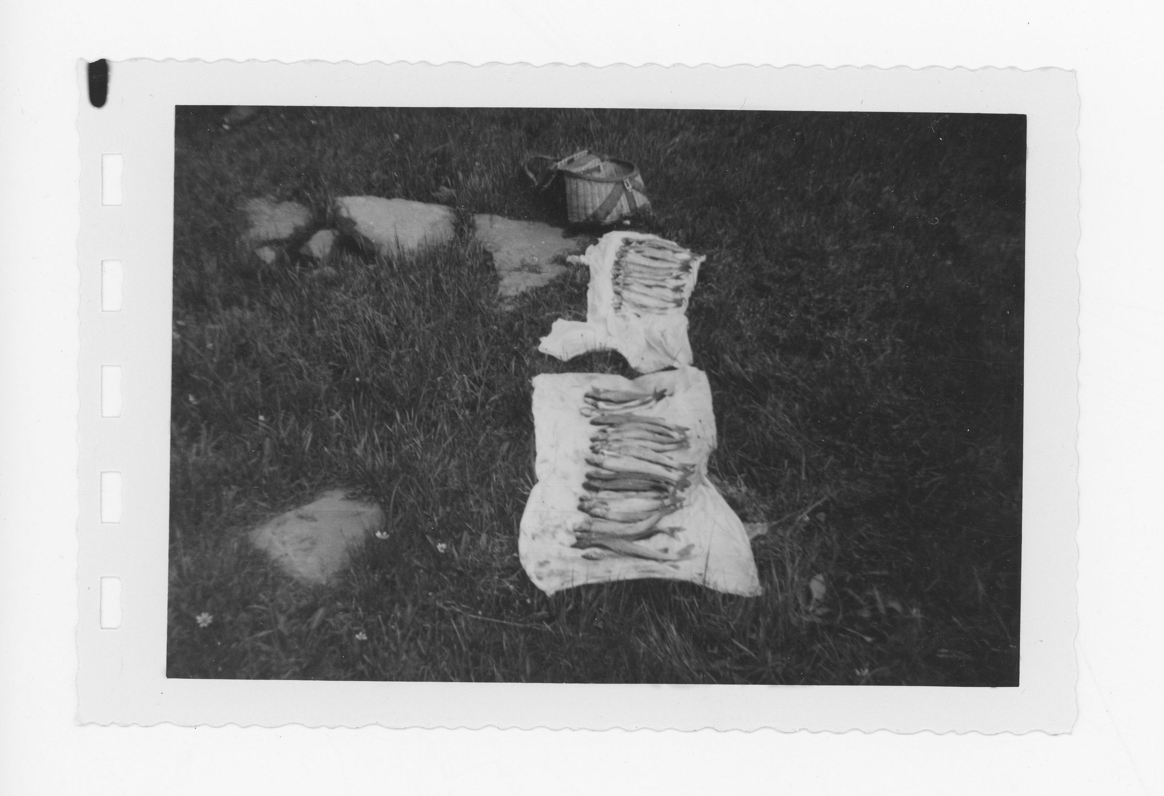 Many fish laid out on towels on the grass outside creel.Photograph Details