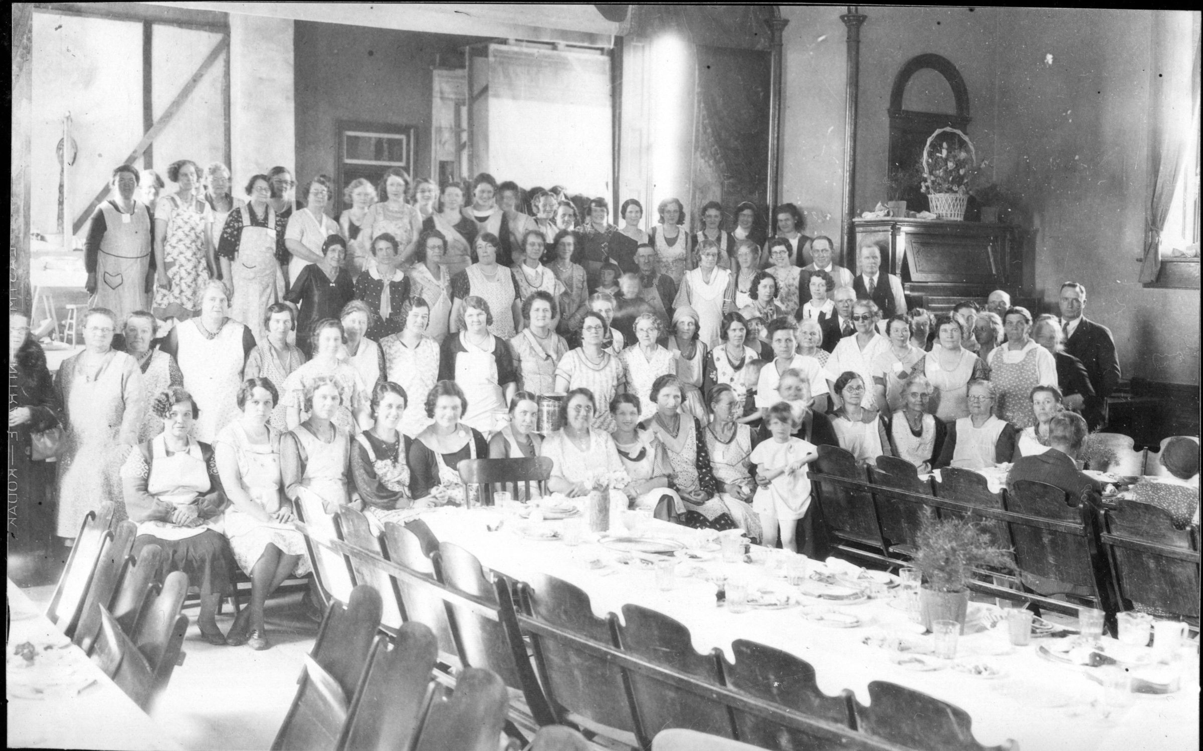 Large group of mostly women wearing aprons who cooked for a Kaysville Ward Relief Society dinner.Photograph Details