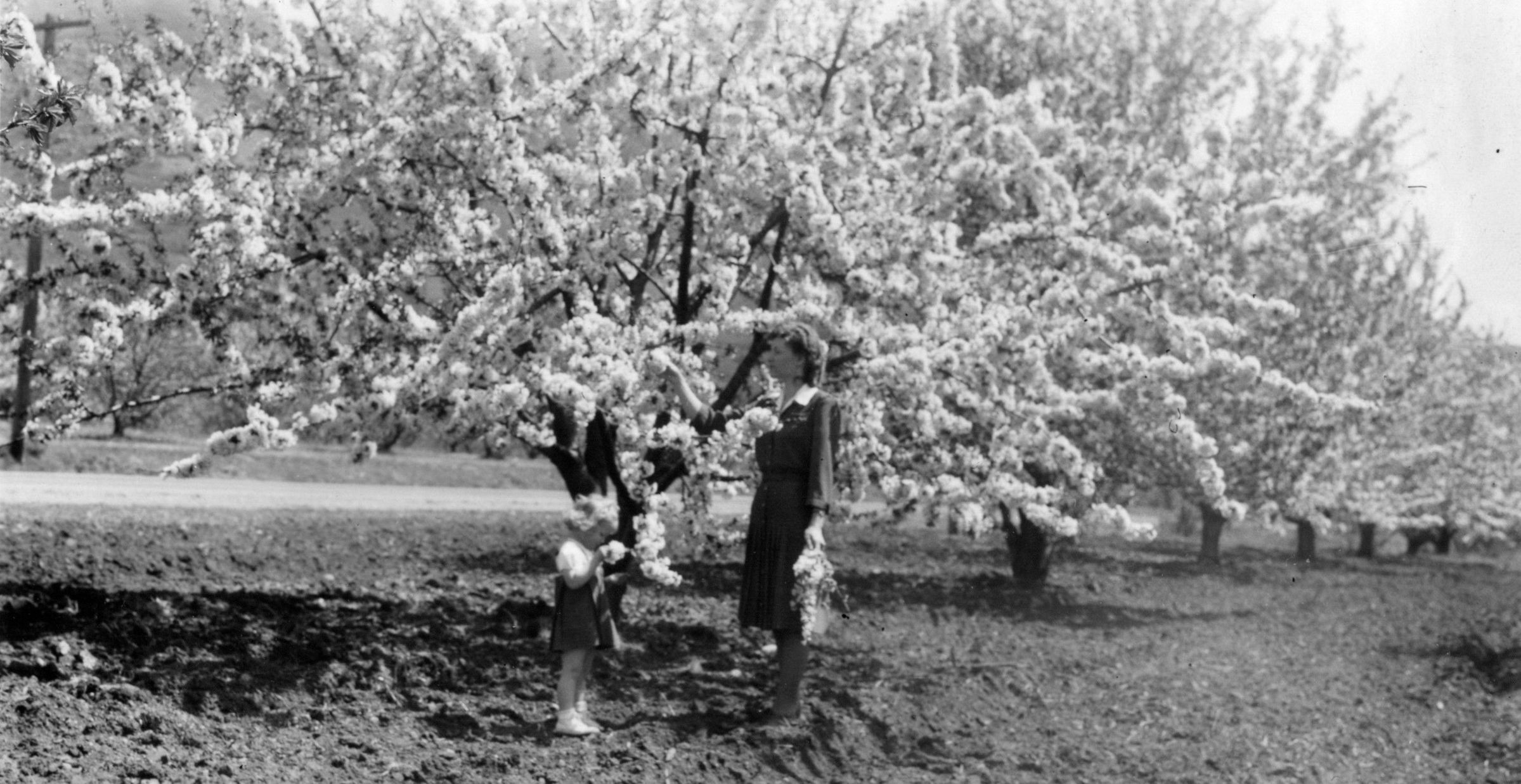 Zillah Butcher and daughter Vernean Butcher standing in blossoming Butcher orchard along old Mountain Road.Photograph Details