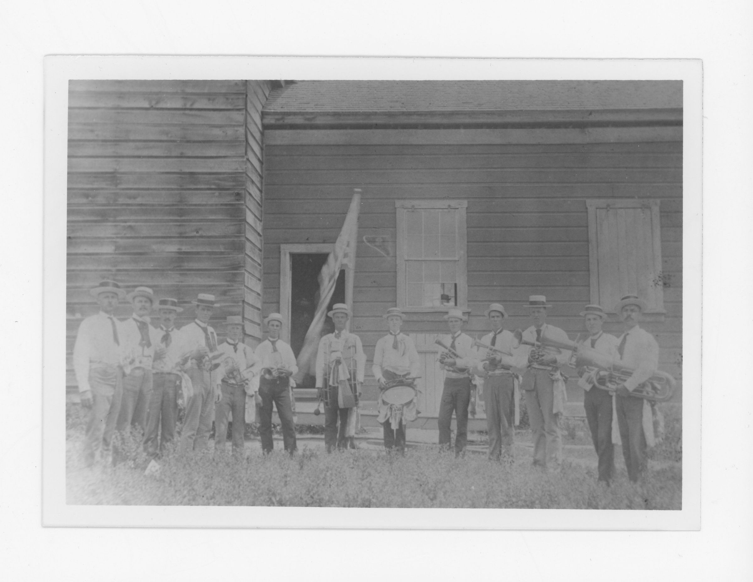 Band members (L-R) Lambert Blamires, Harry Aldous, Joseph Jarman, James Linford, James Jamison, William Smith, Ernest Gailey, Henry Blood, Robert Blamires, Christopher Boynton, John Linford, George Barton, and James Cottrell. The Kaysville Music Hall was located on the corner of 100 East and 100 North-across the street from the Kaysville Elementary School.Collection