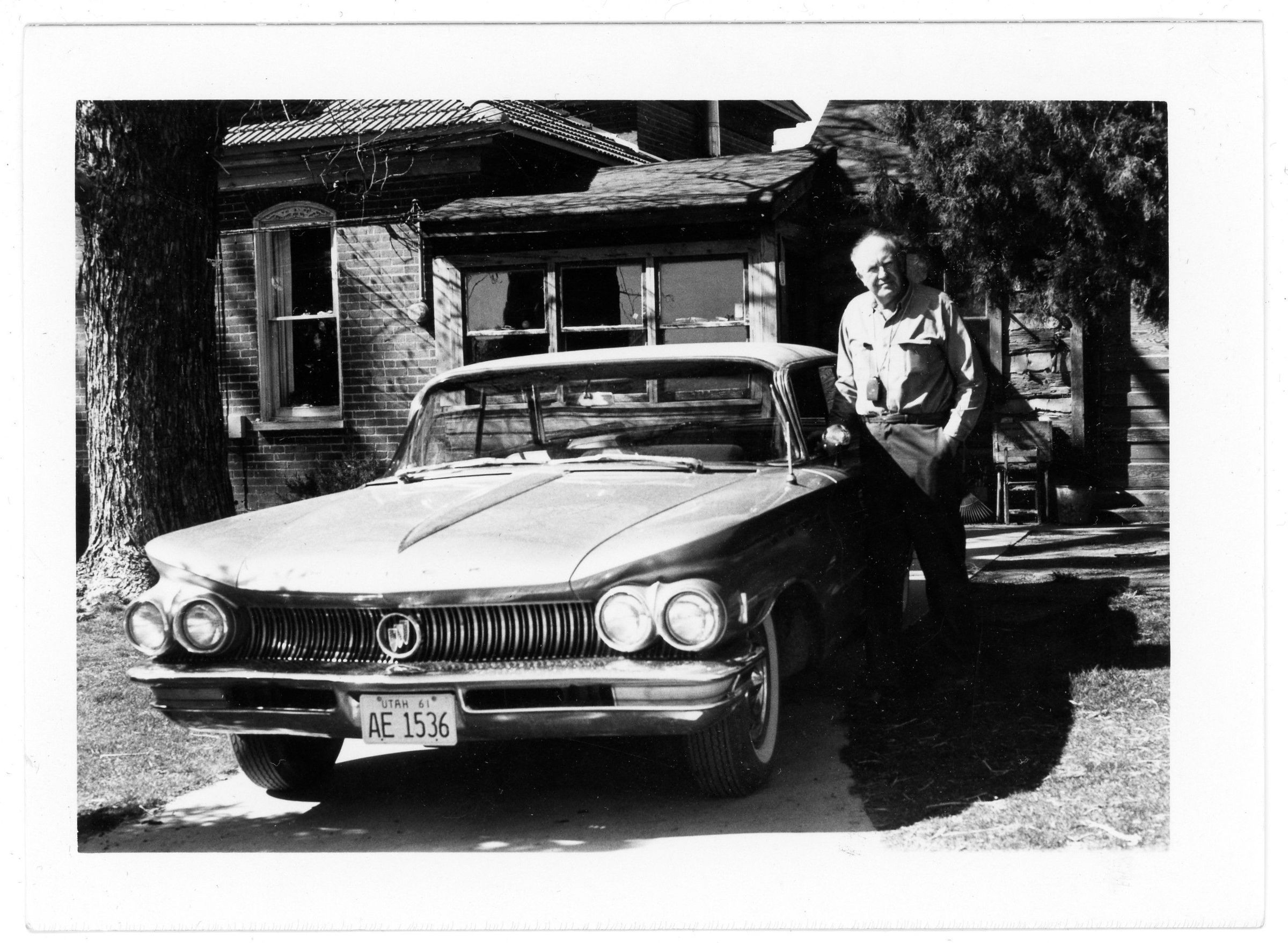 Merlin Ward standing next to car in back yard of family home in Fruit Heights, Utah.Photograph Details
