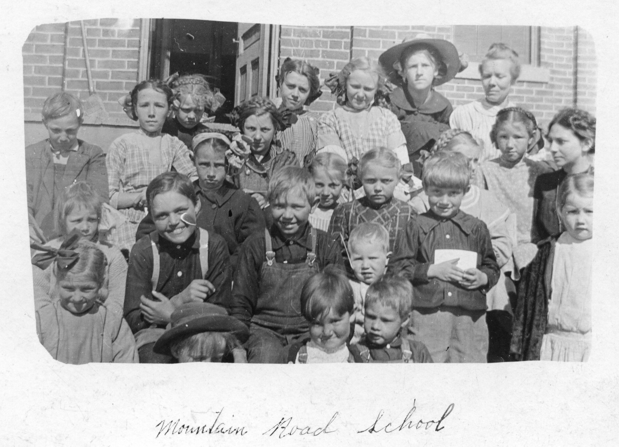 Group of children gathered outside of Mountain Road School Building on north Mountain Road. School classes and Sunday School classes were held in the building.Photograph Details