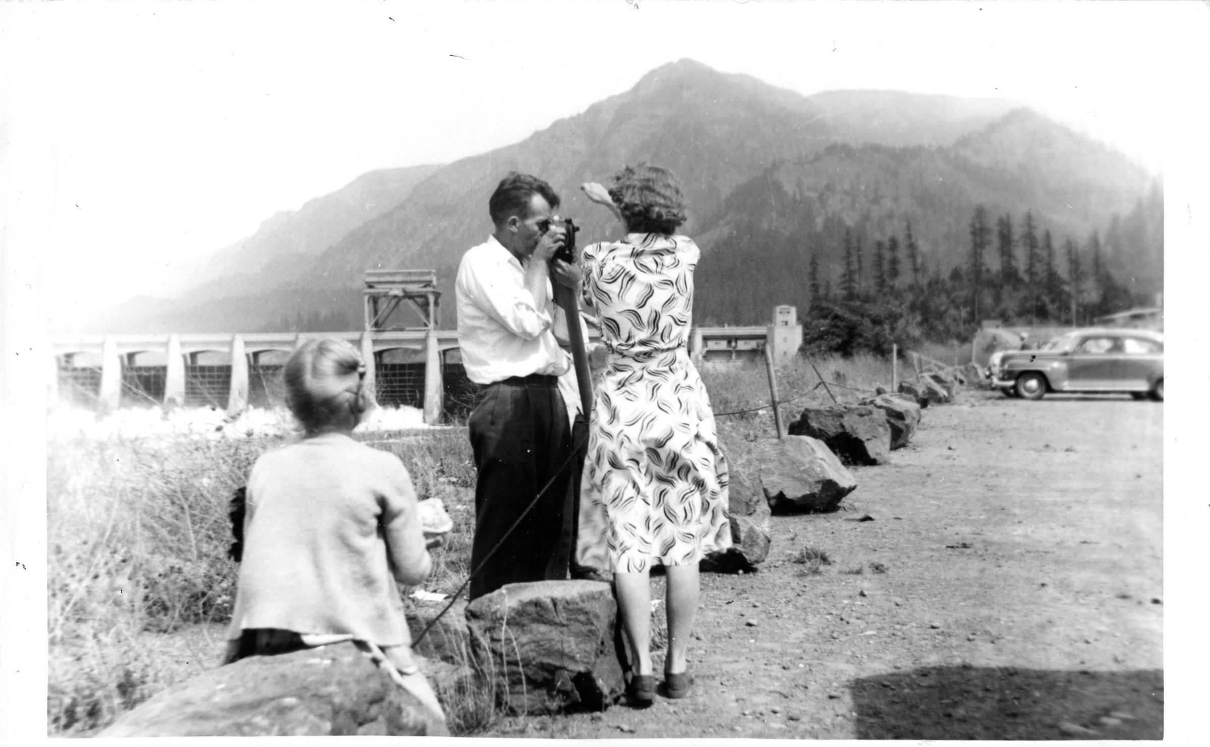 Woman shields camera from sun while man is taking a photograph at viewpoint.Photograph Details