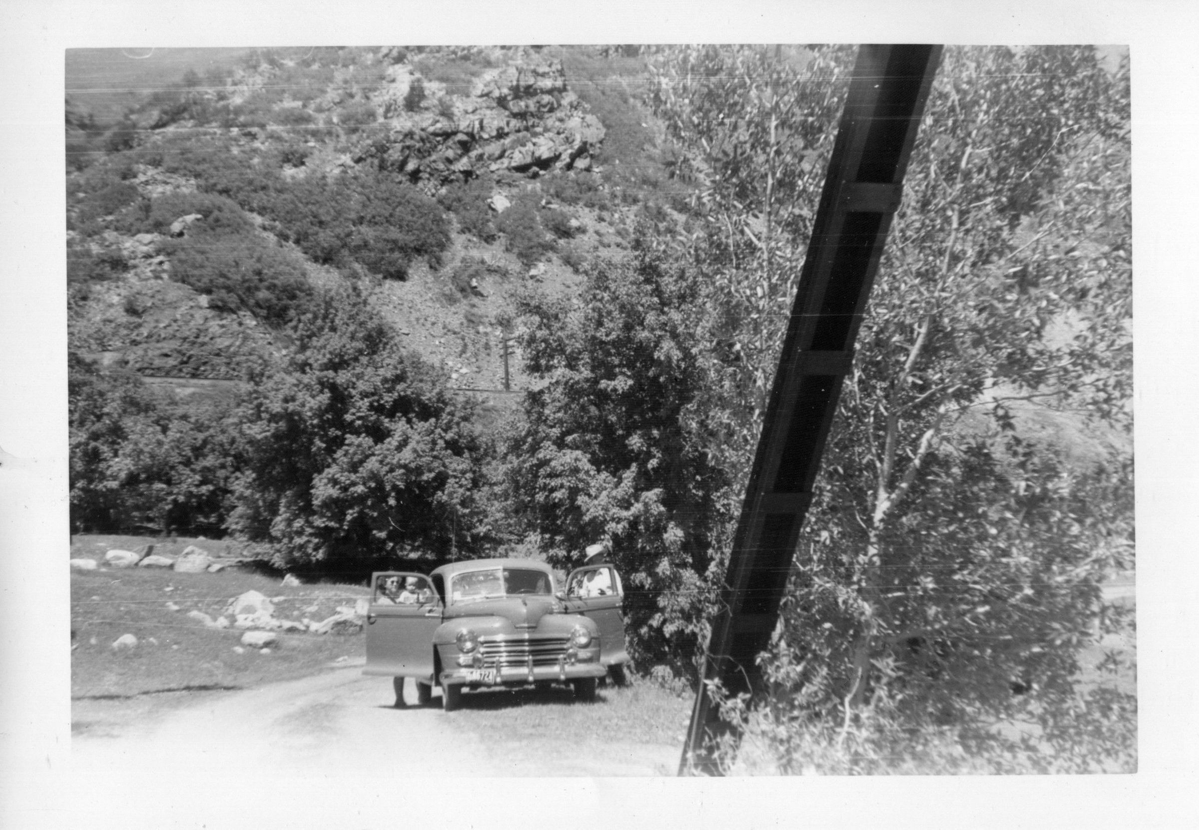 Carrie & Carl Butcher with nephew Don Butcher. Photograph likely in Weber Canyon; railroad is in background with bridge scaffold in foreground.Photograph Details