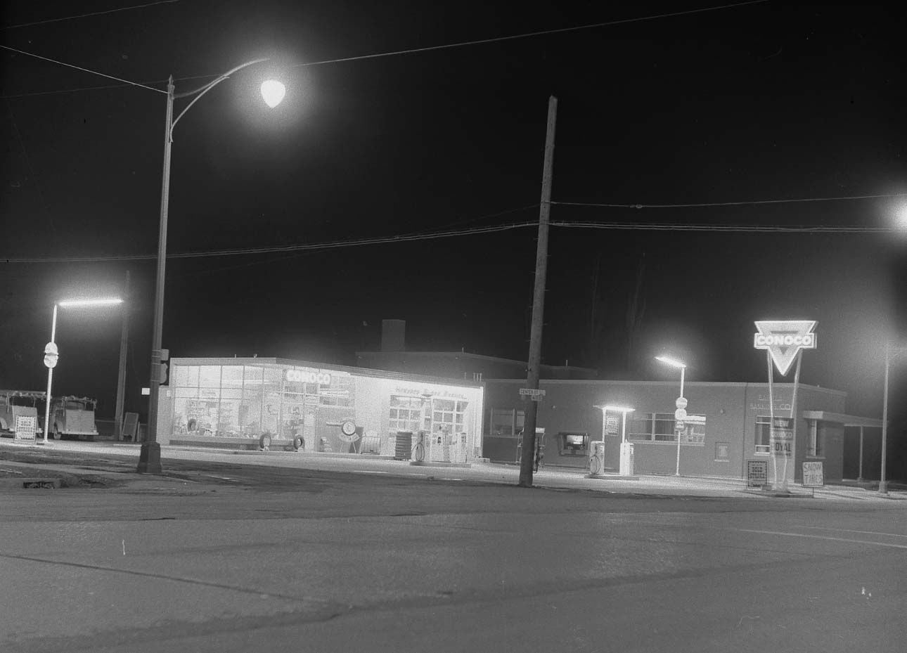 138a Night scene of Howard's Conoco Srvice station & Barnes Bank 1958Dimensions