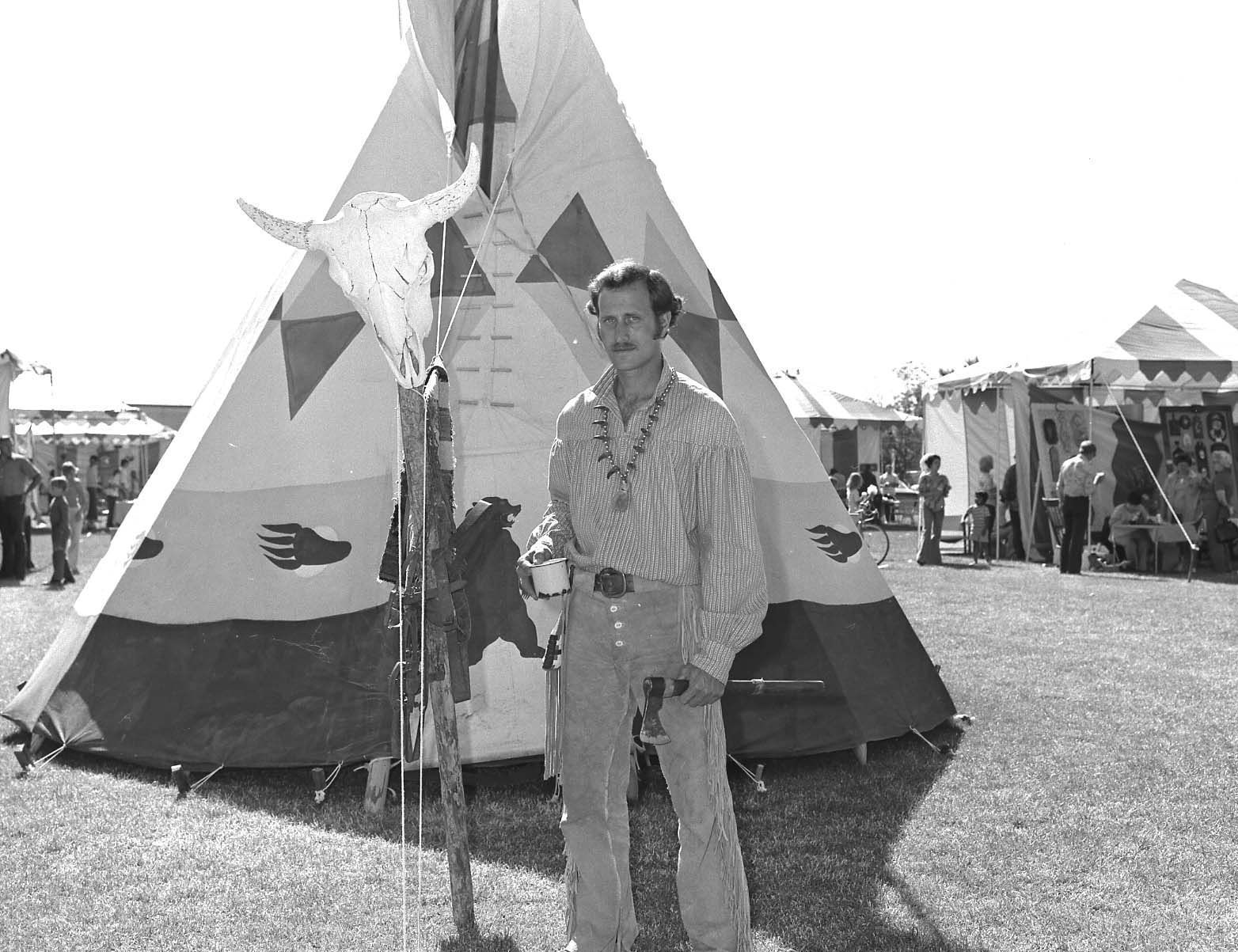 Man standing outside replica of an indigenous tipi at the Kaysville bicentennial celebration.Photograph Details