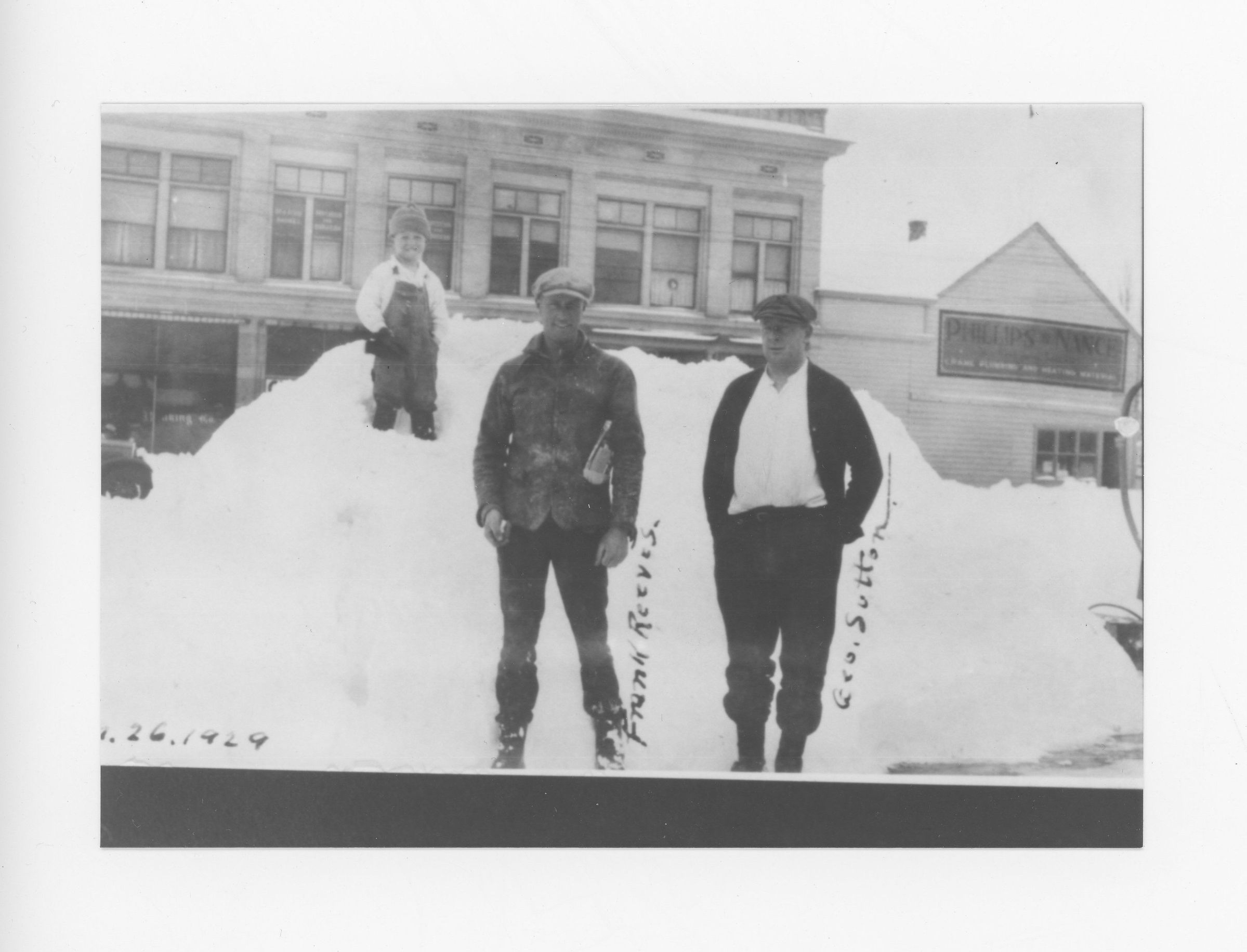 Frank Reeves and George Sutton on Kaysville's Main Street. Barnes Bank and the Bowman's Store in the background. The boy is unidentified. Year of the heavy snow of 1929.Photograph Details